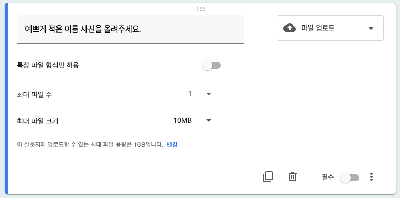 **그 이상의 크기의 파일을 허용하고 싶다면, 파란색 변경 글씨를 클릭한 뒤 '업로드되는 모든 파일의 최대 크기'를 1TB까지로 바꿀 수 있습니다. 이때의 값은 설문지의 문항 전체에서 파일의 크기의 합입니다.