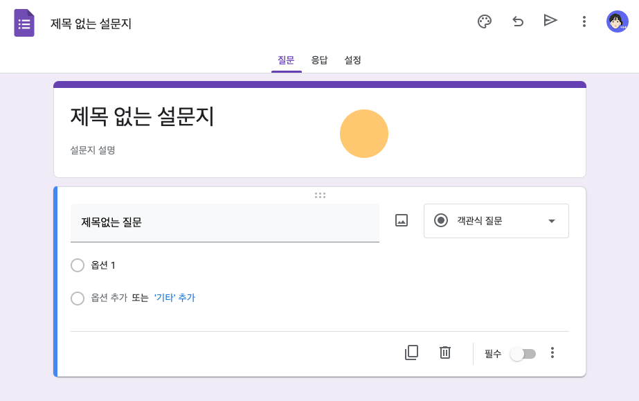 설문지를 새로 만들면 이렇게 문항이 하나 만들어져 있습니다.