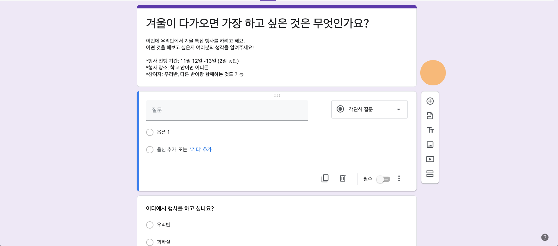 - 설명: 각 질문 블록의 큰 질문 아래에 설명을 적을 수 있는 칸이 나옵니다. 질문에 대한 추가 설명이 필요할 때 사용하면 좋습니다.