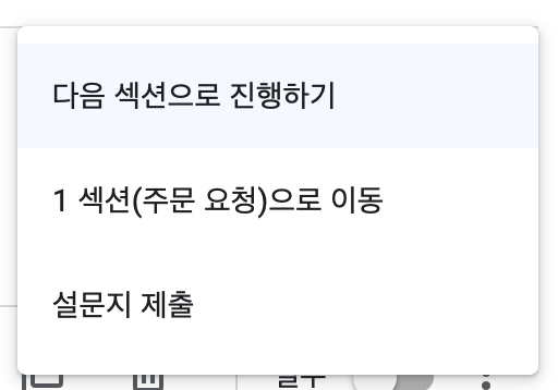 - 체크박스: 선택 개수(최대/최소/특정) - 답변을 기준으로 섹션 이동: 특정 옵션을 선택하면 연결된 특정 섹션으로 이동합니다.