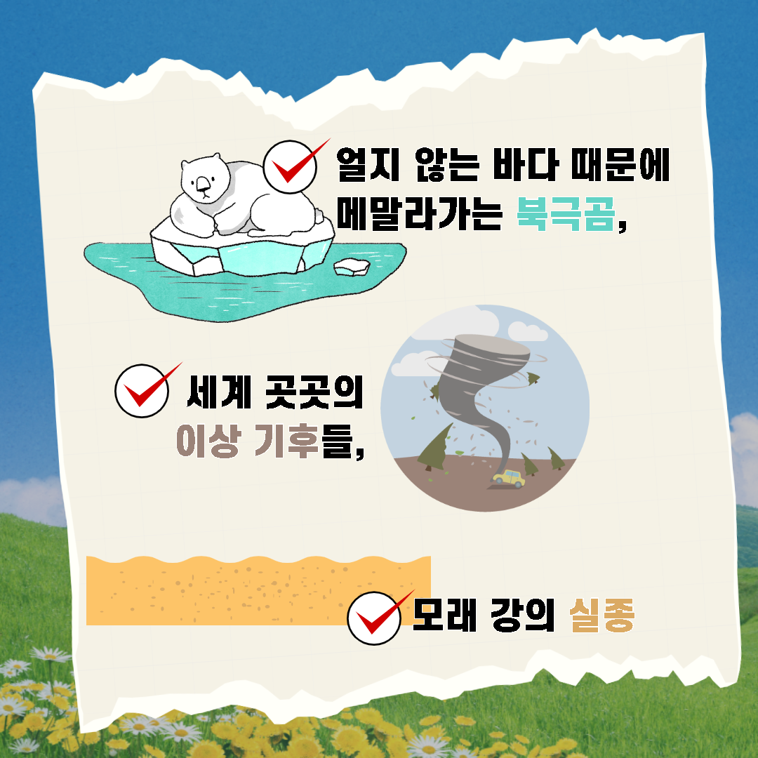 우리가 환경을 보호하기 위해 실천할 수 있는 일들을 적어보고 하루동안 지켜봅시다.