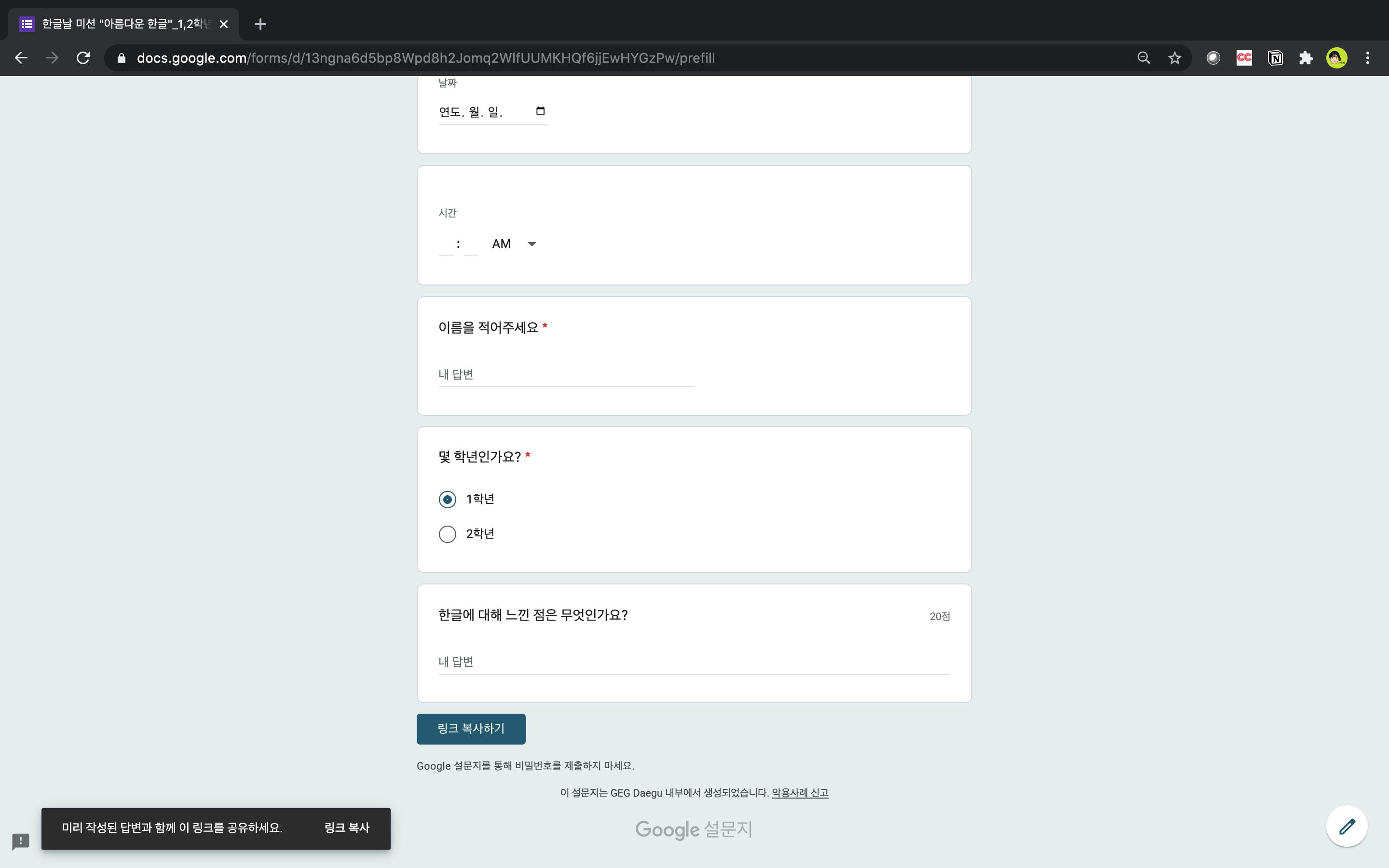 4) 필요한 곳에 링크를 붙여넣으면 해당 응답이 기록된 채로 공유할 수 있습니다. - 예를 들어 위의 화면의 경우,학생이 들어왔을 때 이미 '몇 학년인가요?'라는 질문에 '1학년'으로 응답이 입력되어 있는 것입니다.