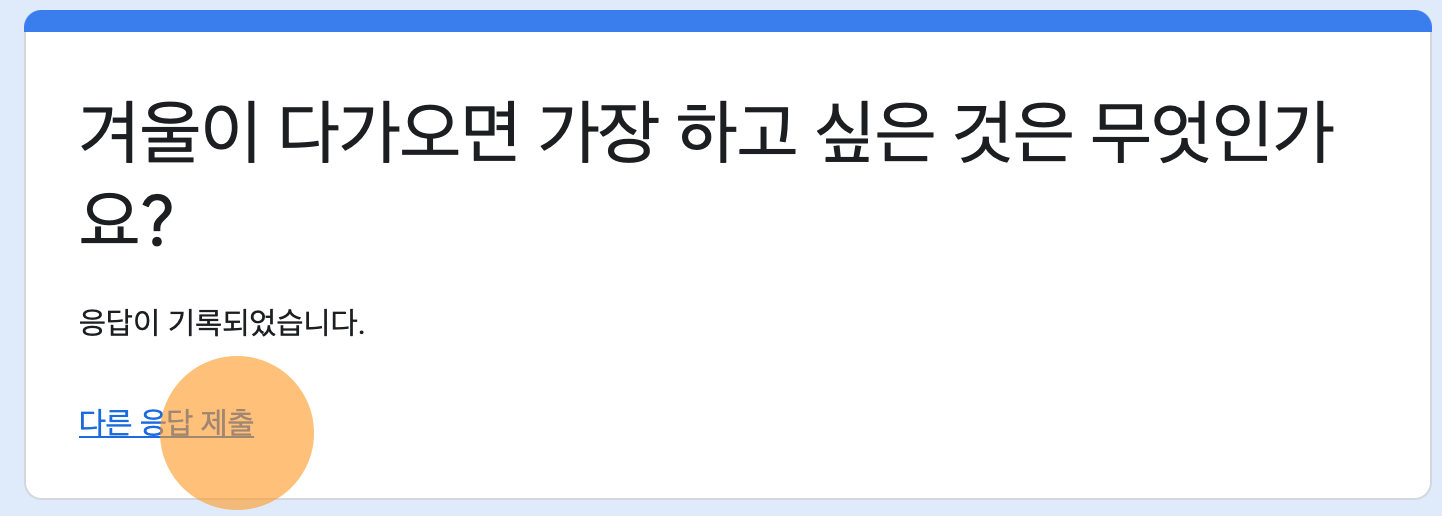 - 다른 응답을 제출할 링크 표시: 응답을 한 번 제출한 후에 다른 응답을 또 제출할 수 있습니다. 응답을 제출한 화면에 '다른 응답 제출'이라는 하이퍼링크가 생기는데요, 이 글씨를 누르면 설문지에 다시 응답할 수 있는 페이지로 이동합니다.