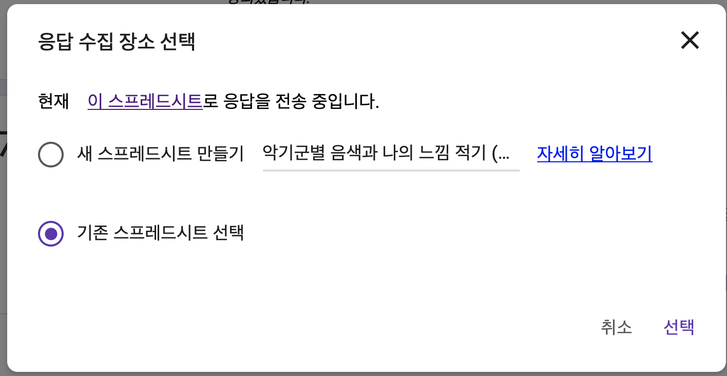 - 기존 스프레드시트 선택: 전체 응답을 기록할 시트를 기존 스프레드시트에 만듭니다. 오른쪽 사진에서 선택 버튼을 누릅니다. 기록할 스프레트시트를 고른 후 선택 버튼을 누릅니다.