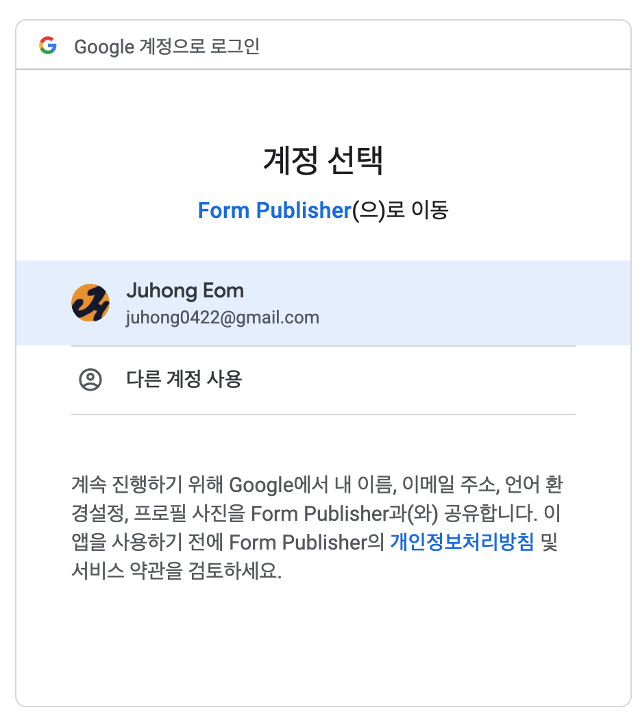 - 설치 버튼을 누르고, 창이 뜨면 계속 버튼을 누릅니다. 그리고 다운로드할 계정을 선택합니다. 이때의 계정을 설문지를 만드는 계정과 동일해야 합니다.