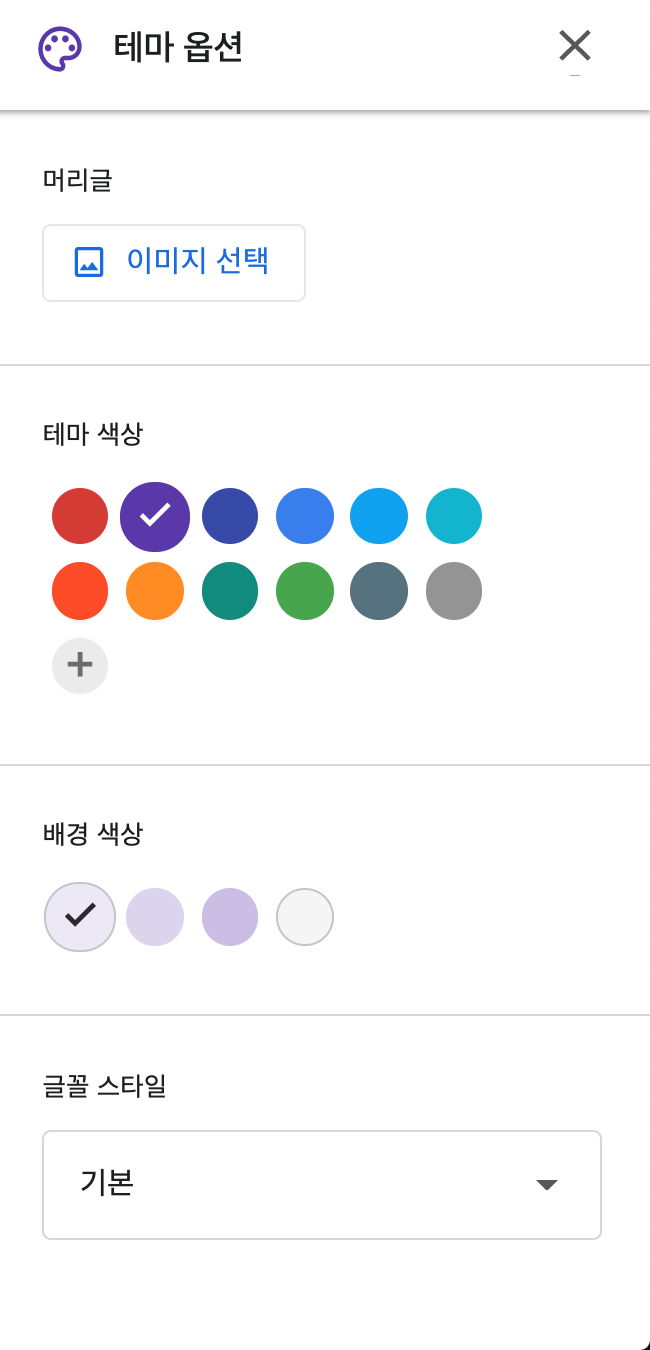 - 배경 색상: 선택한 테마 색상에 따라 추천된 배경 색상이 나타납니다. 테마 색상보다 연한 색 3가지와 회색 중에 선택할 수 있습니다.