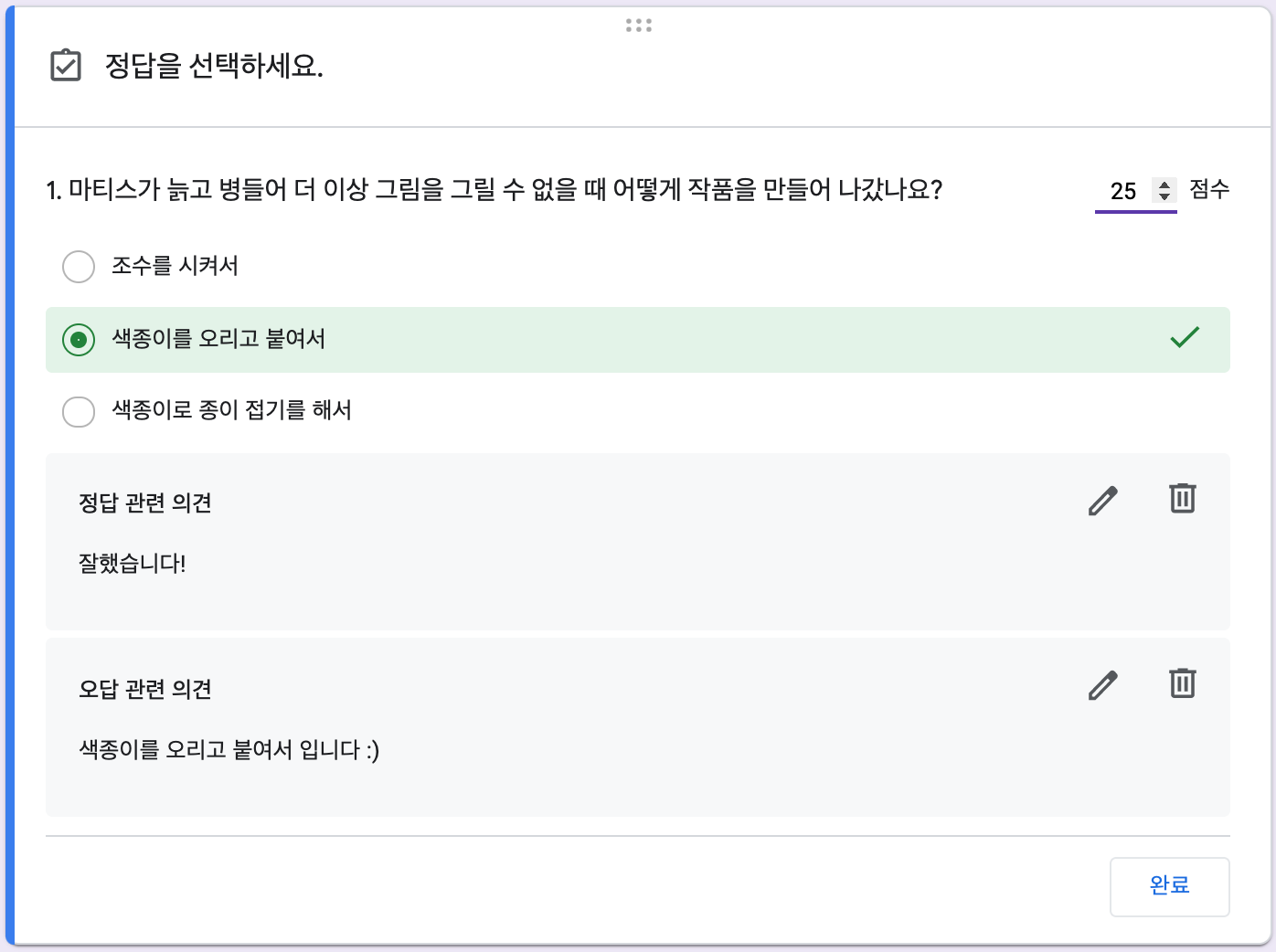 > 제출 후 바로 공개: 학생이 자신의 응답을 제출하고 본인의 점수를 바로 확인할 수 있습니다.