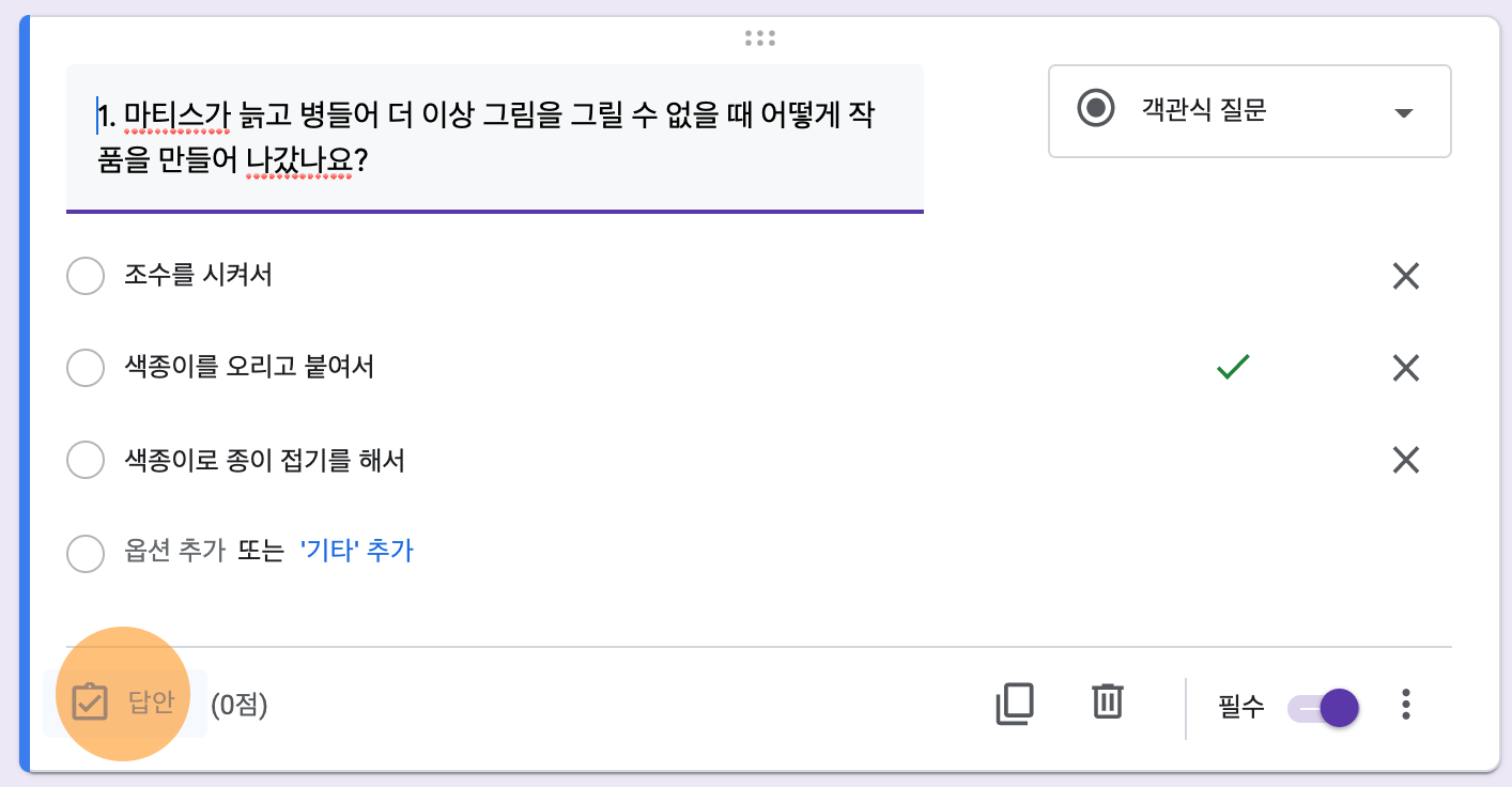 퀴즈로 만들기 글씨 옆을 눌러 이 기능을 활성화시키면, 설문지의 각 질문에 대한 정답을 만들 수 있습니다. 정답과 학생의 응답을 비교하여, 응답에 점수를 매기는 퀴즈로 사용할 수 있습니다.