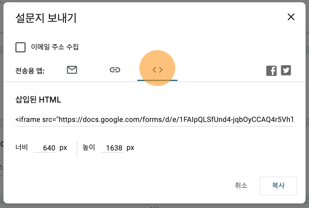 < > 버튼을 누르면 HTML 코드가 나타납니다. 이 코드를 복사한 후, 원하는 HTML 파일에 붙여넣기합니다. 해당 화면에서 설문지를 바로 볼 수 있도록 공유할 수 있습니다.