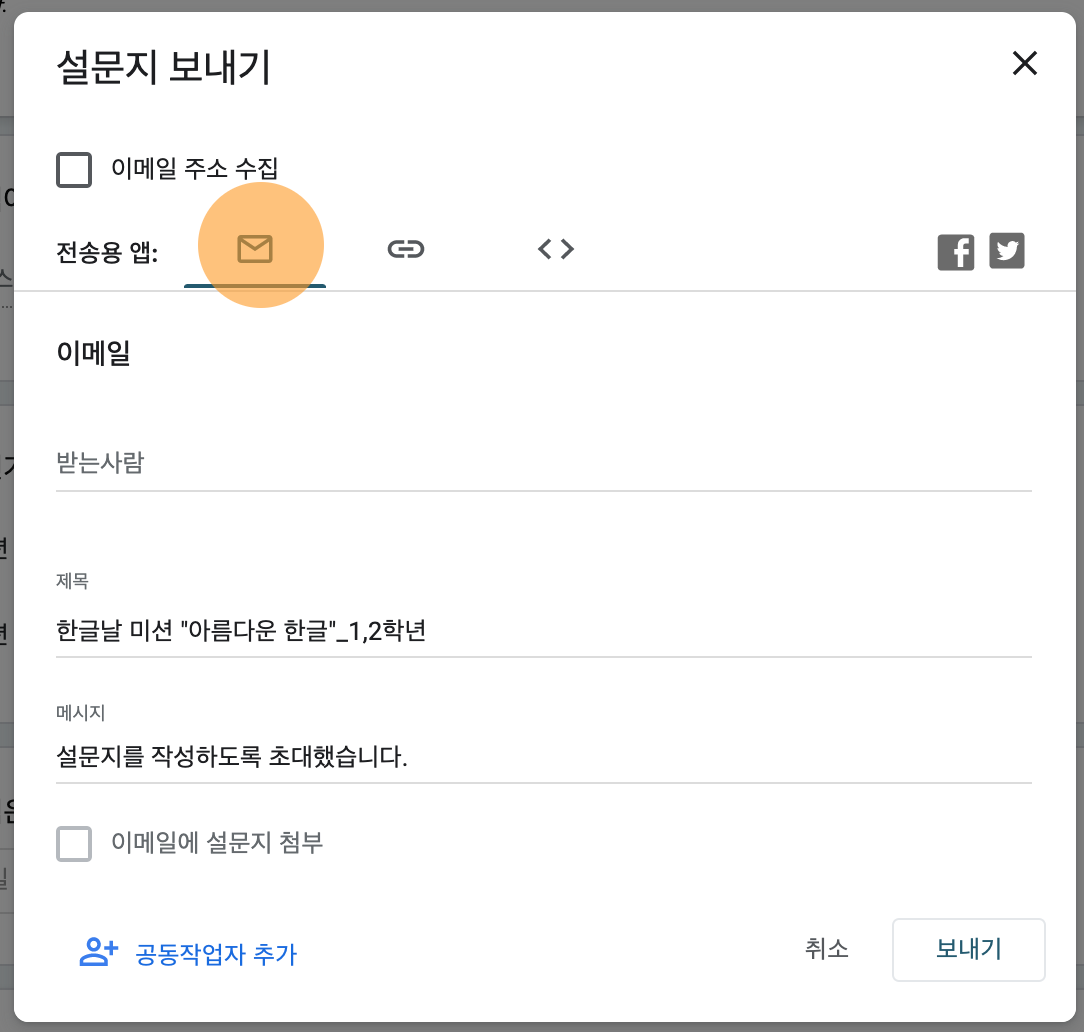 - 설문지 수정 화면에서 오른쪽 상단의 보내기 버튼을 누르고, 왼쪽 하단의 공동작업자 추가 버튼을 누릅니다.