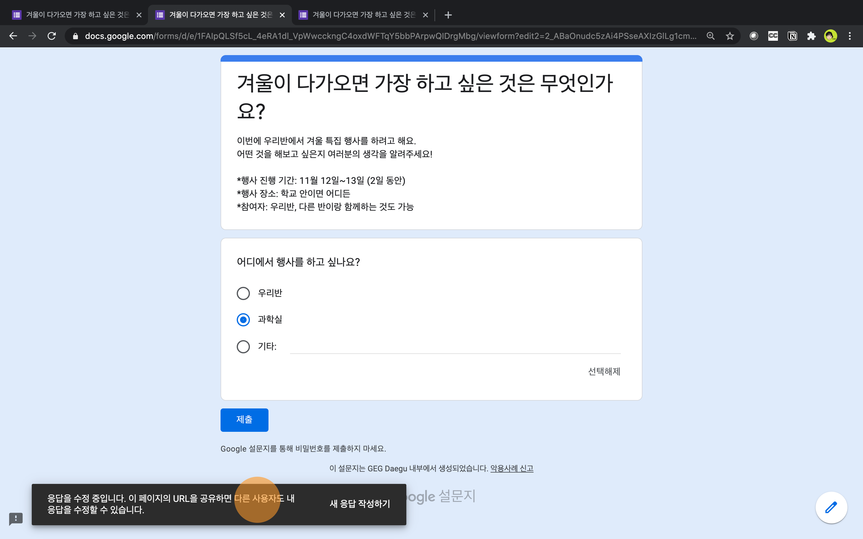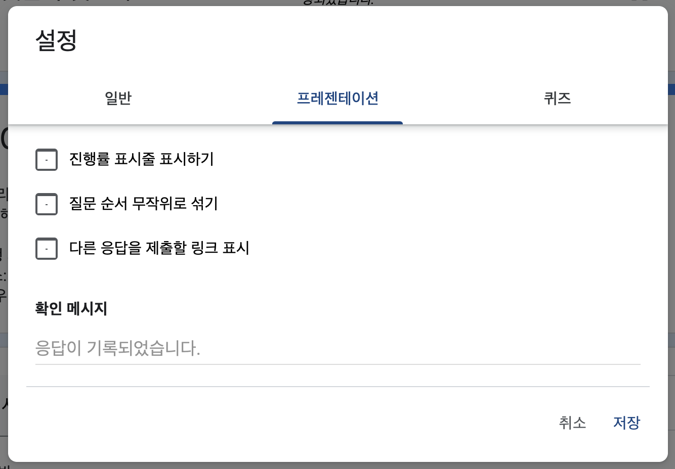 단, '일반'의 응답 횟수 1회로 제한' 기능을 켜면, 이 기능은 사용할 수 없습니다. 한 번만 제출해야 하니까요!