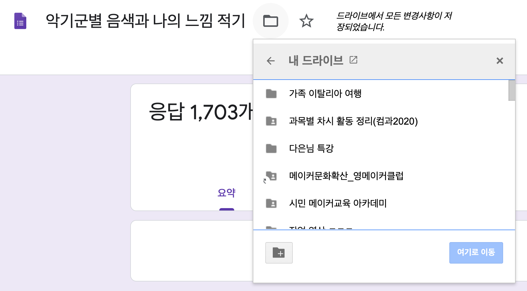 - 왼쪽 상단의 설문지 제목 옆의 폴더 모양의 폴더로 이동 버튼을 클릭합니다. 나타난 창에서 해당 설문지를 저장하고자 하는 폴더를 선택하고, 여기로 이동 버튼을 누릅니다.