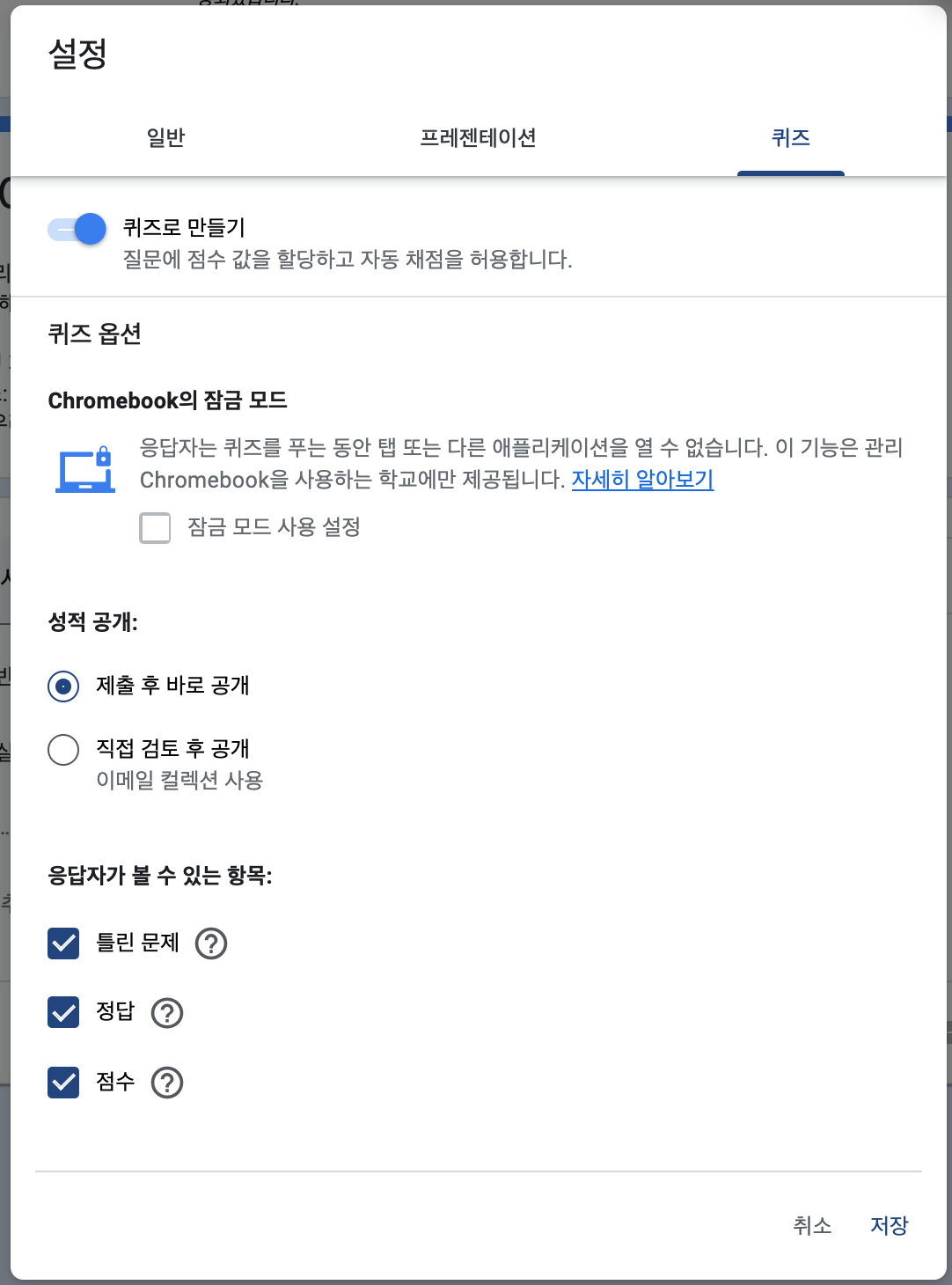 > Chromebook의 잠금모드: 이 기능은 크롬북을 사용하여 설문지에 응답하고 있을 때 활성화할 수 있습니다. 이 기능을 켜면, 컨닝을 방지하고 해당 활동에의 집중을 돕기 위해 다른 앱을 없도록 합니다.