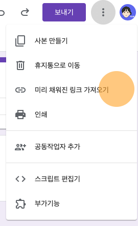 1) 설문지 편집 화면 오른쪽 상단에 있는 점 3개 버튼을 누르고, 그 아래의 미리 채워진 링크 가져오기 버튼을 누릅니다. 그러면 응답을 작성할 수 있는 설문지가 새 탭이나 창으로 뜹니다.