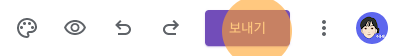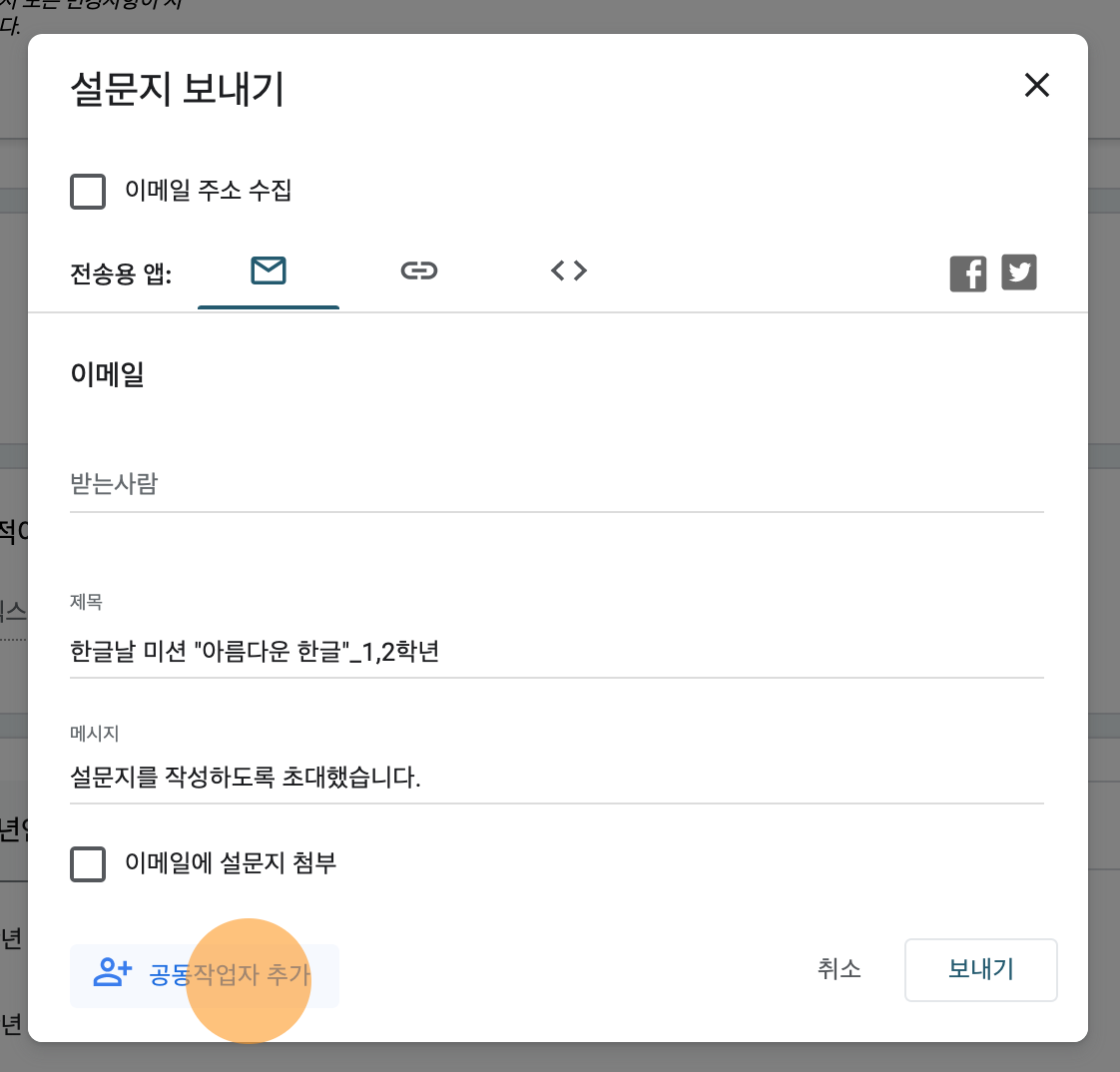 - 설문지 수정 화면에서 오른쪽 상단의 보내기 버튼을 누르고, 왼쪽 하단의 공동작업자 추가 버튼을 누릅니다.