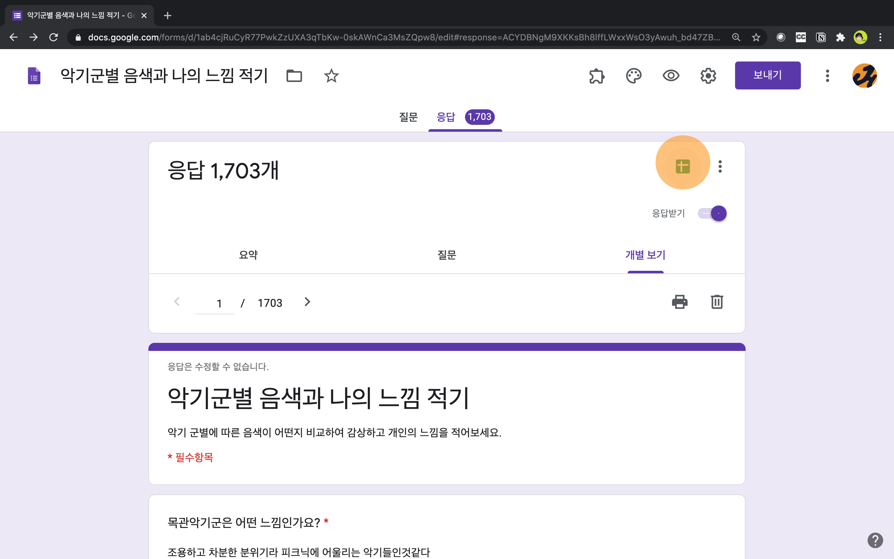 초록색 표 모양 버튼을 누르면, 해당 설문지의 전체 응답을 구글 스프레드시트에서 새로운 스프레스시트가 자동으로 만들어집니다.