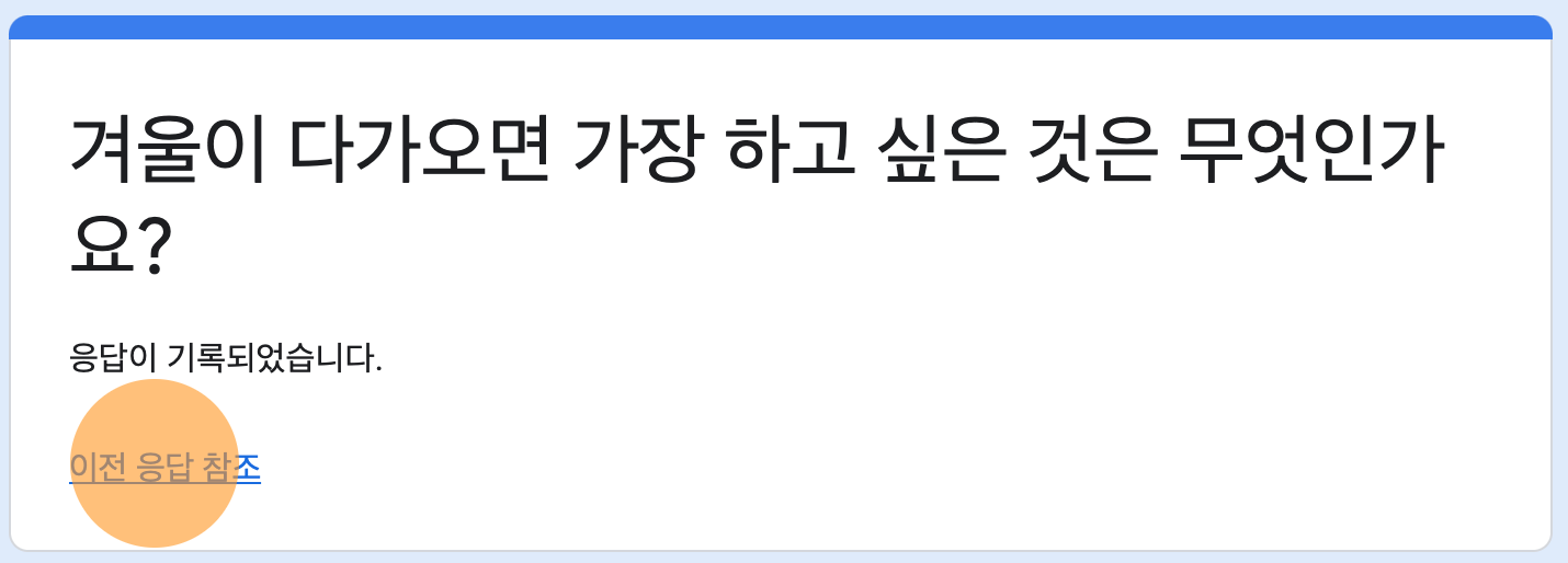 > 요약 차트와 텍스트 응답 확인: 다른 사람들의 응답 결과를 전체적으로 정리한 표를 볼 수 있습니다. '이전 응답 참조'라는 하이퍼링크가 생기는데, 이를 누르면 오른쪽 사진과 같은 화면이 나타납니다.