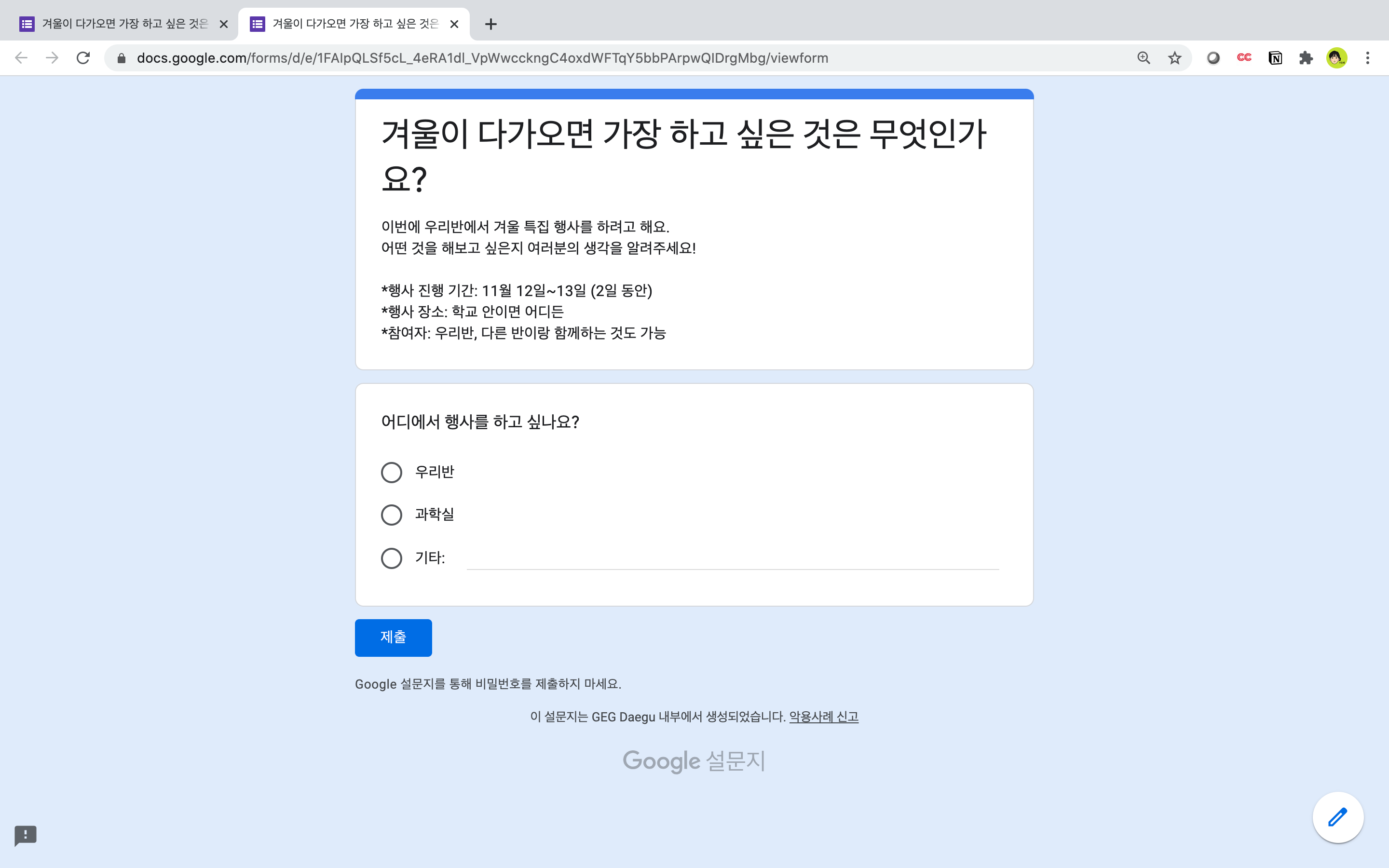 - 응답 횟수 1회로 제한: 학생이 로그인해야 답변을 제출할 수 있습니다.(그래야 1번 제출했는지 확인할 수 있겠죠? :) )