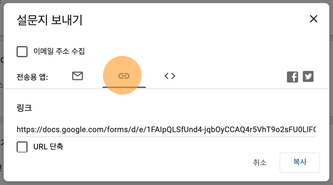 **구글 사이트에 복사 붙여넣기했을 때 바로 설문지가 보이게 하기 위해서는 URL을 단축하지 않고 원래 긴 URL을 그대로 붙여넣기합니다.
