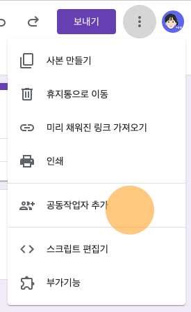 - 설문지 수정 화면에서 오른쪽 상단의 점 3개 버튼을 누르고, 공동작업자 추가 버튼을 누릅니다.