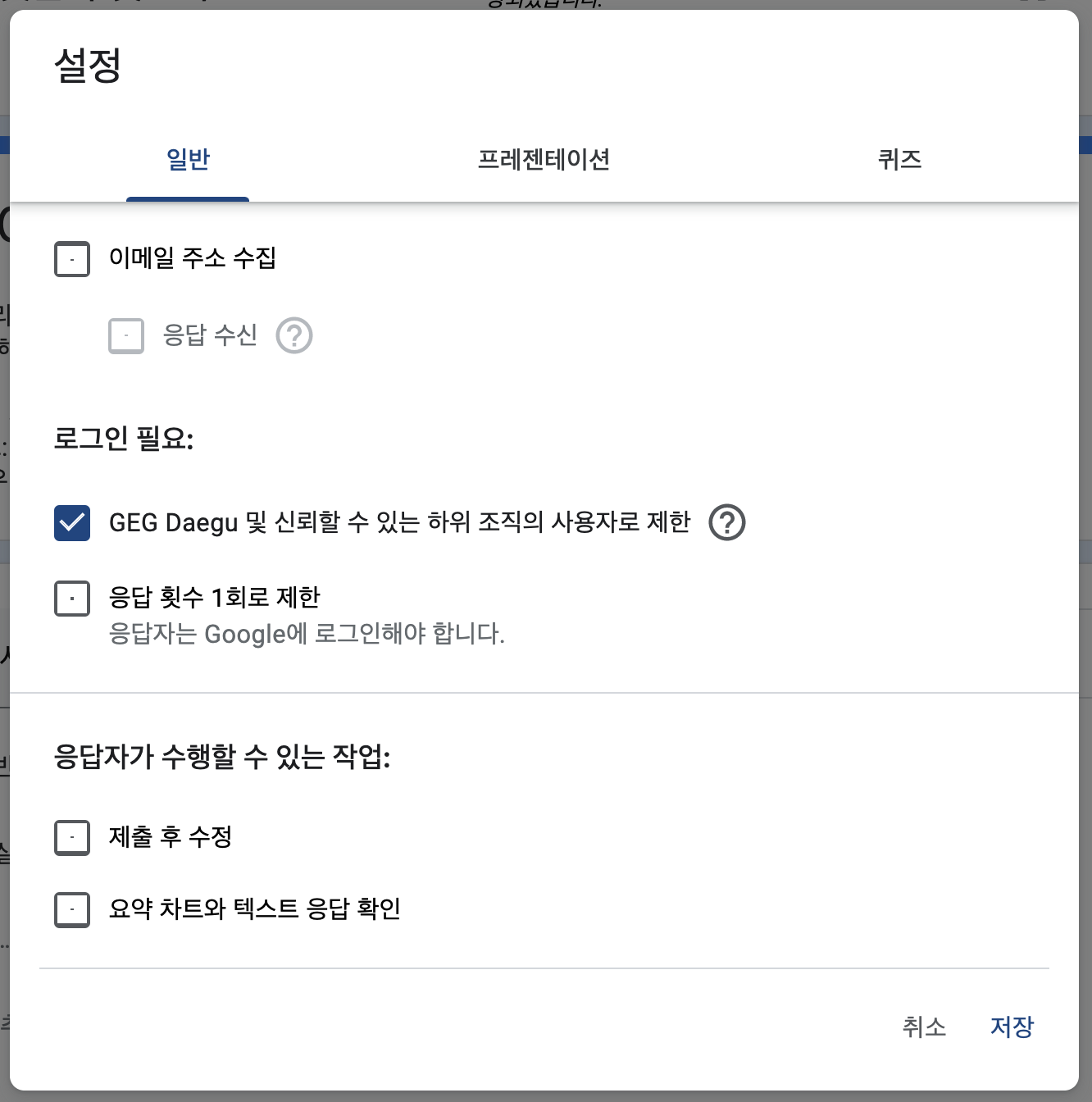 > ('조직명') 및 신뢰할 수 있는 하위 조직의 사용자로 제한: G Suite 계정인 경우만 보이는 기능입니다. 조직에 속해 있는 계정으로만 응답할 수 있습니다.