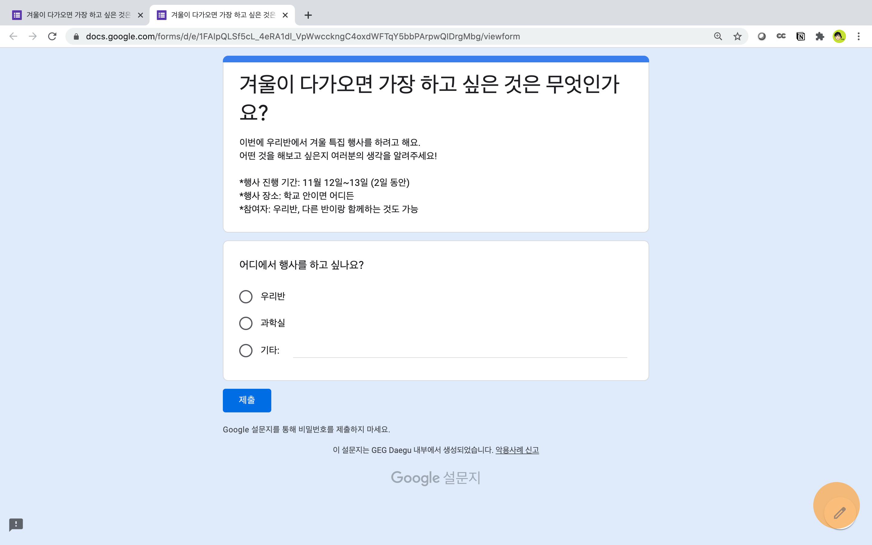 > 응답 횟수 1회로 제한: 구글 계정으로 로그인하고 응답할 수 있으며, 한 계정으로 한 번만 응답할 수 있습니다.
