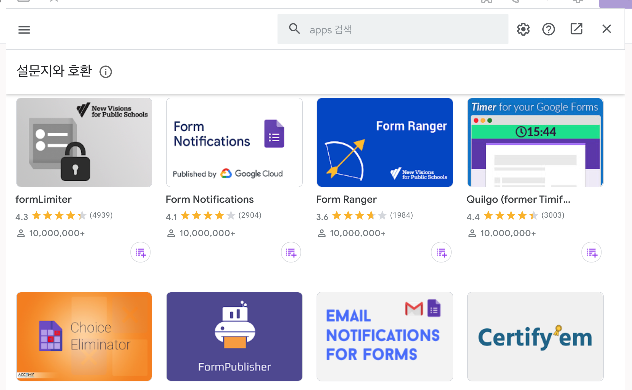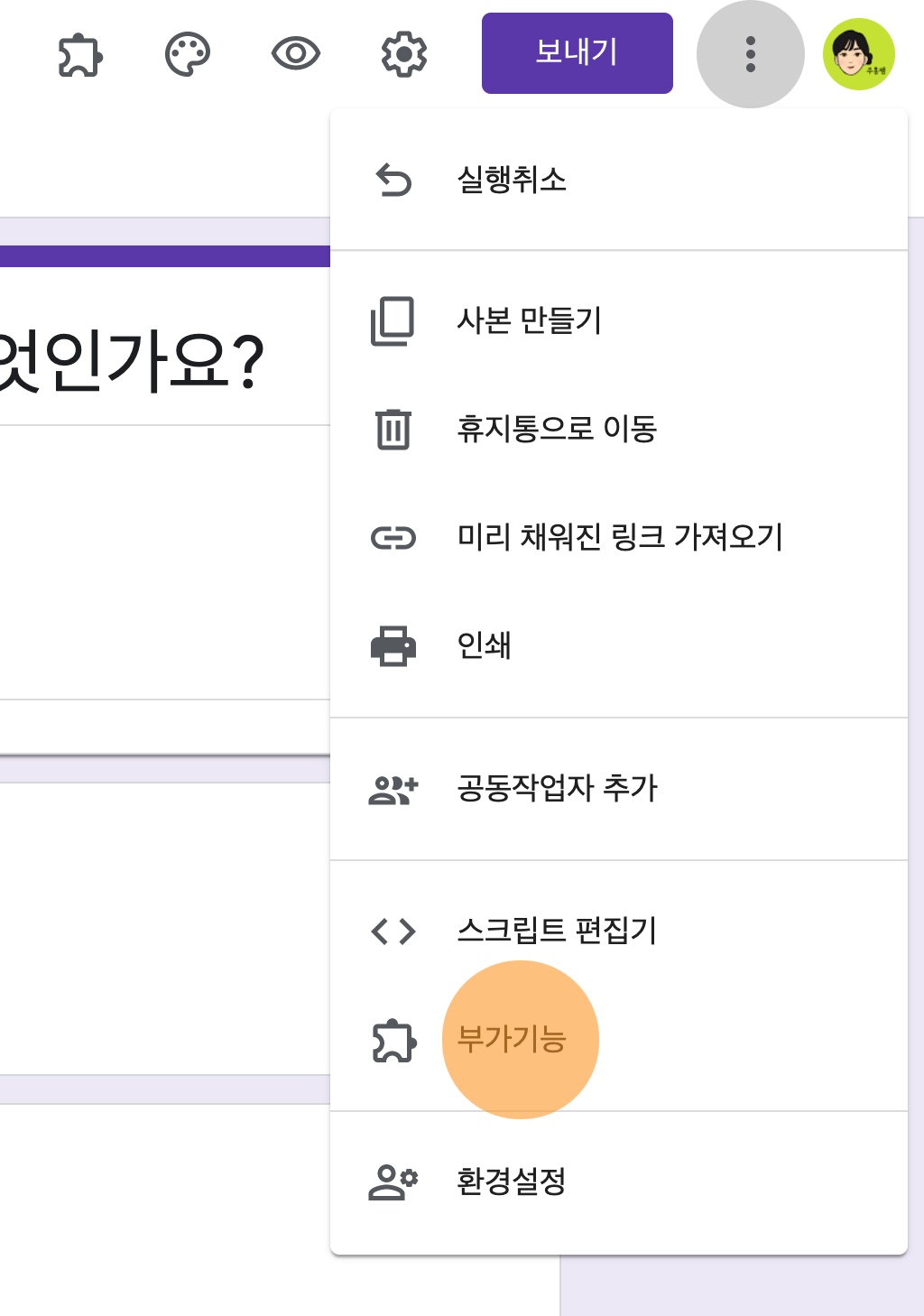 부가기능은 설문지를 더 유용하게 사용할 수 있도록 다른 사람들이 만들어 놓은 무료 기능입니다.