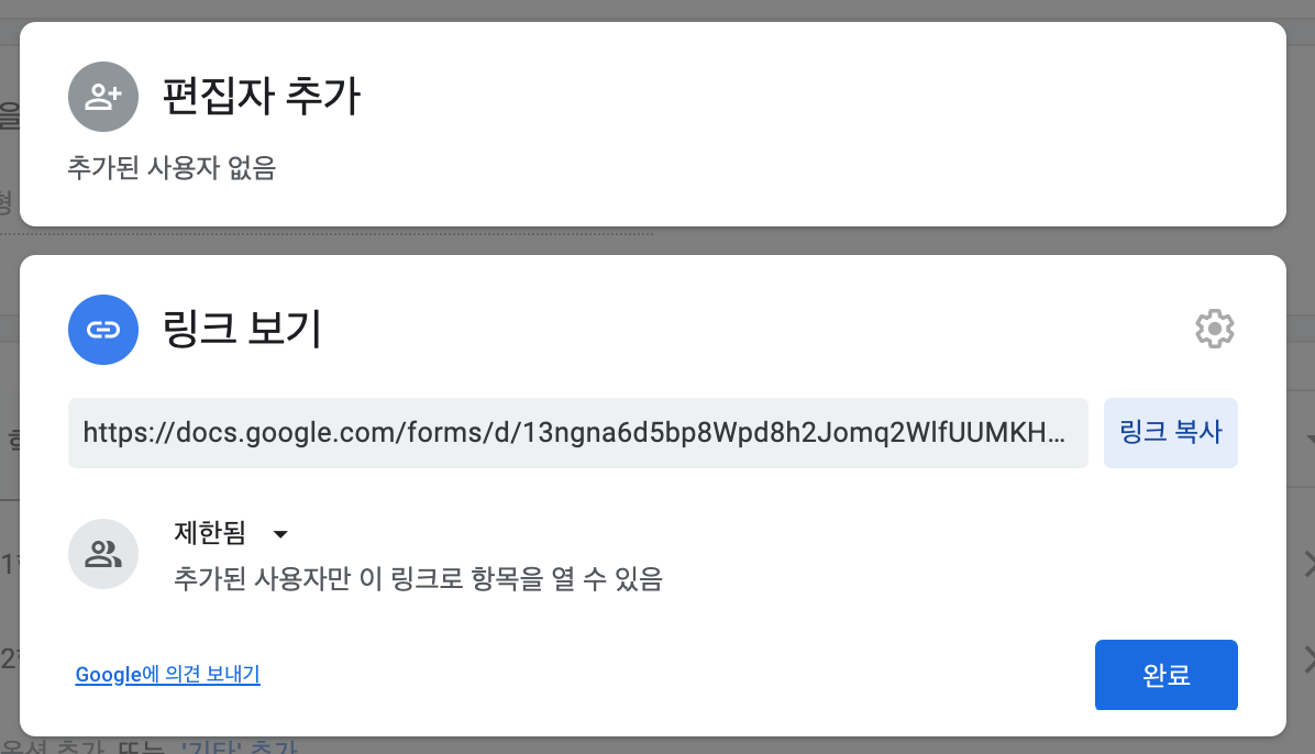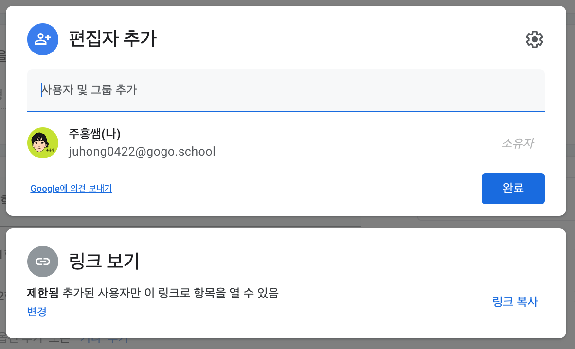 - 제한됨: 이메일로 직접 추가한 사용자만이 이 링크로 들어와 편집할 수 있습니다.