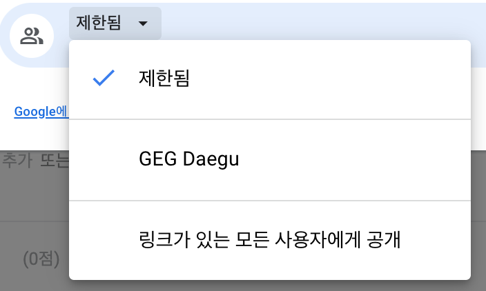 - 조직명(화면상 GEG Daegu): 가운데 사진의 경우처럼 G Suite 계정일 경우에만 나타나는 옵션입니다. 조직의 전체 사용자만이 이 링크로 들어와 편집 수 있습니다.