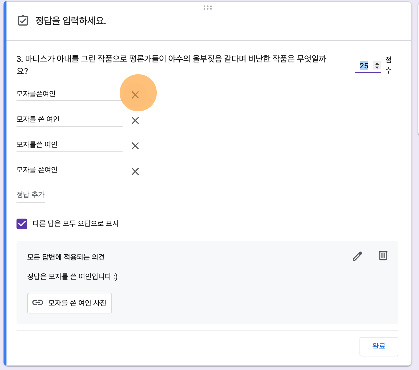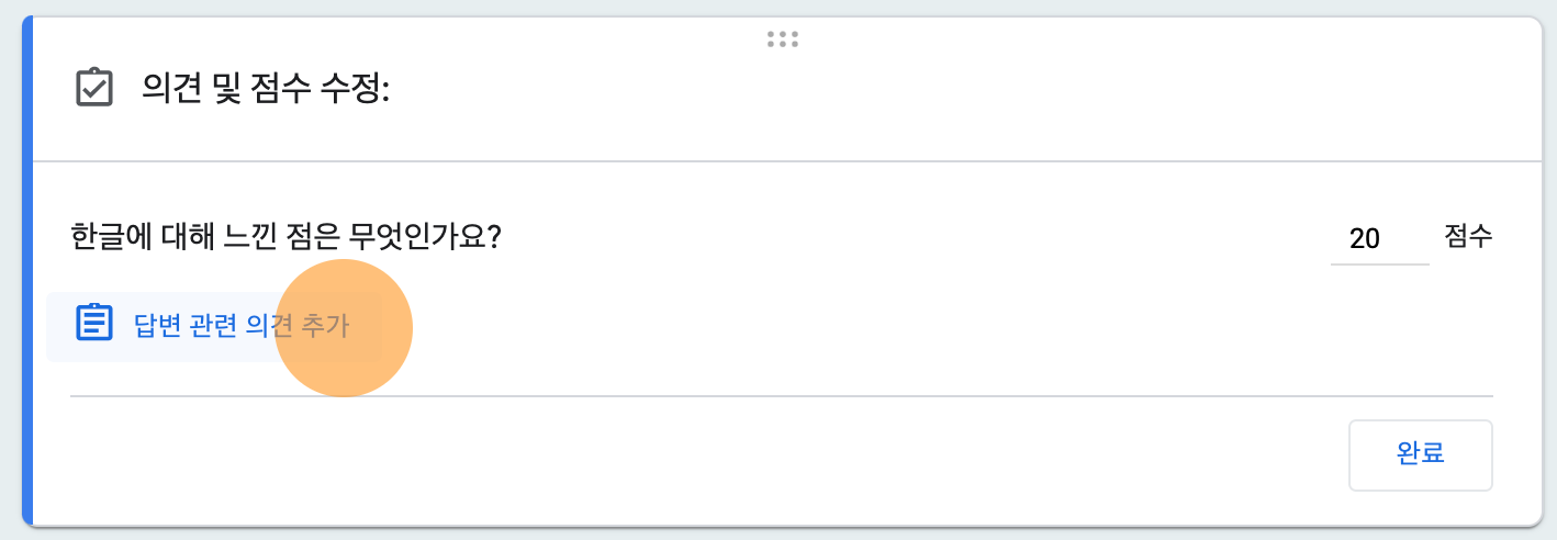 > 답변 관련 의견 추가: 답변 관련 의견 추가 버튼을 누르면 응답 후에 답을 확인할 떄 학생들이 볼 수 있는 설명이 나타납니다.