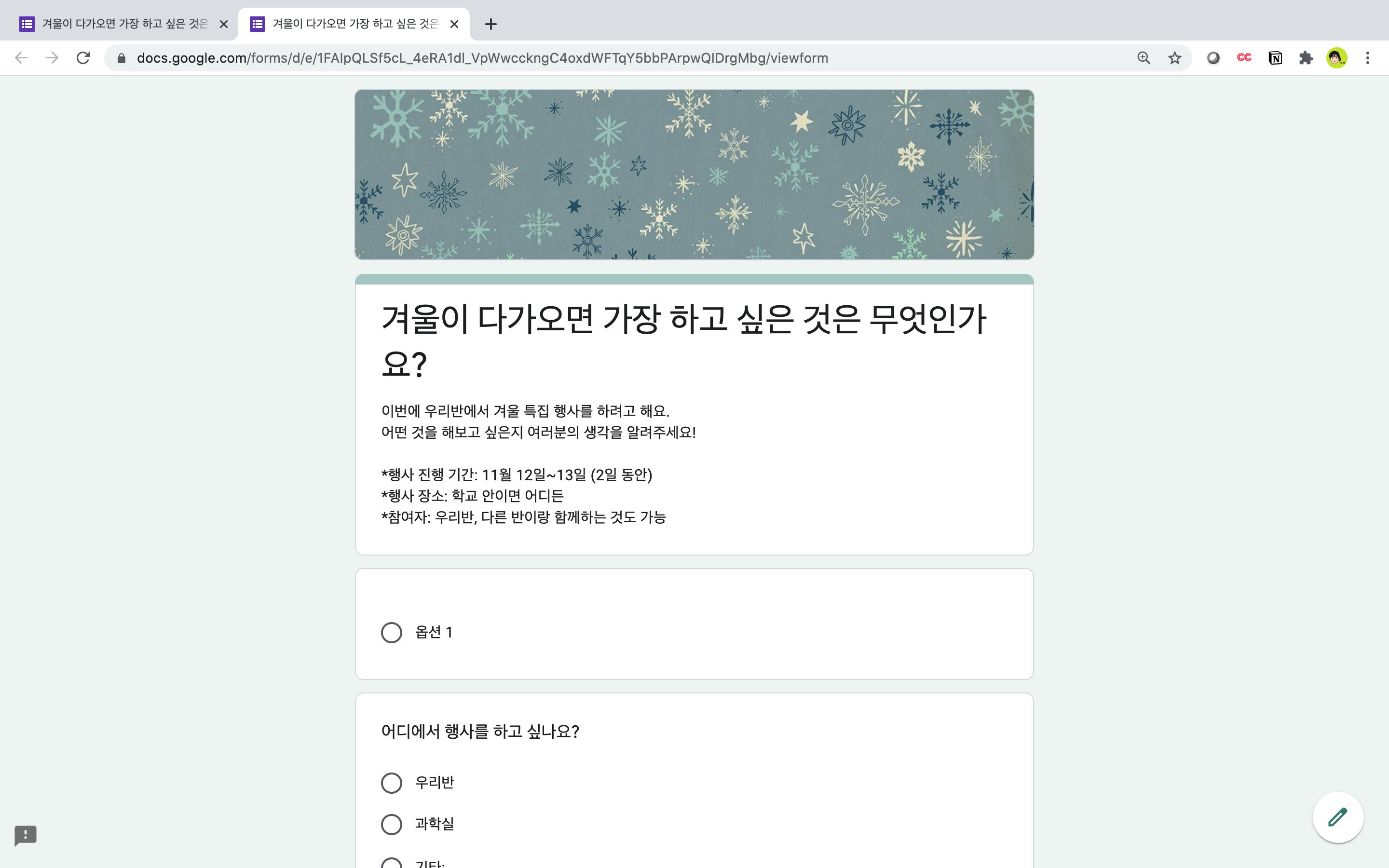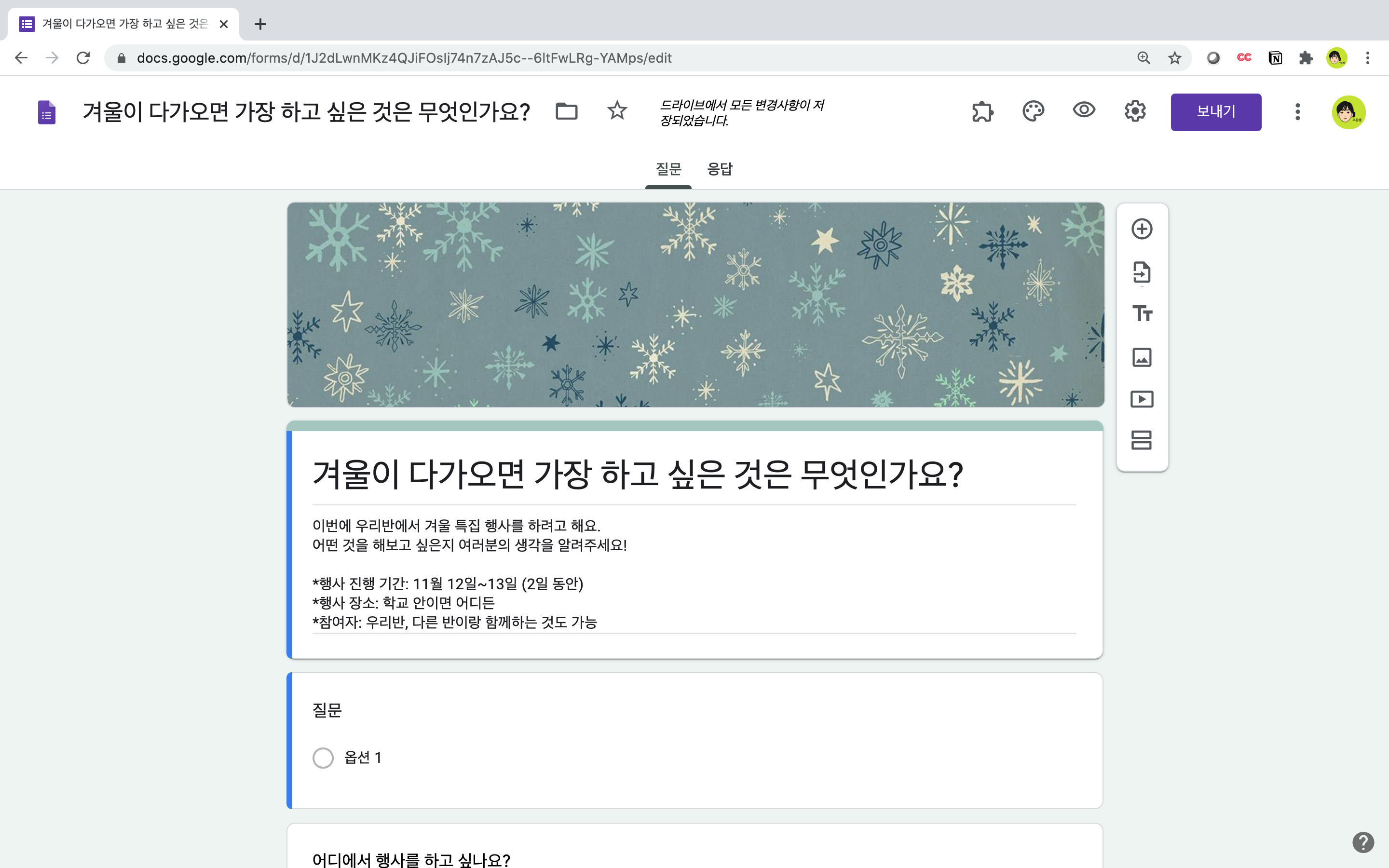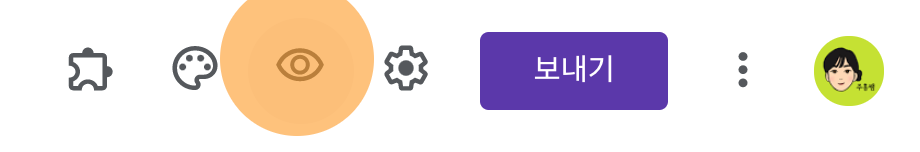 미리보기 기능을 활용해서 학생들이 보는 설문지 화면을 확인할 수 있습니다.
