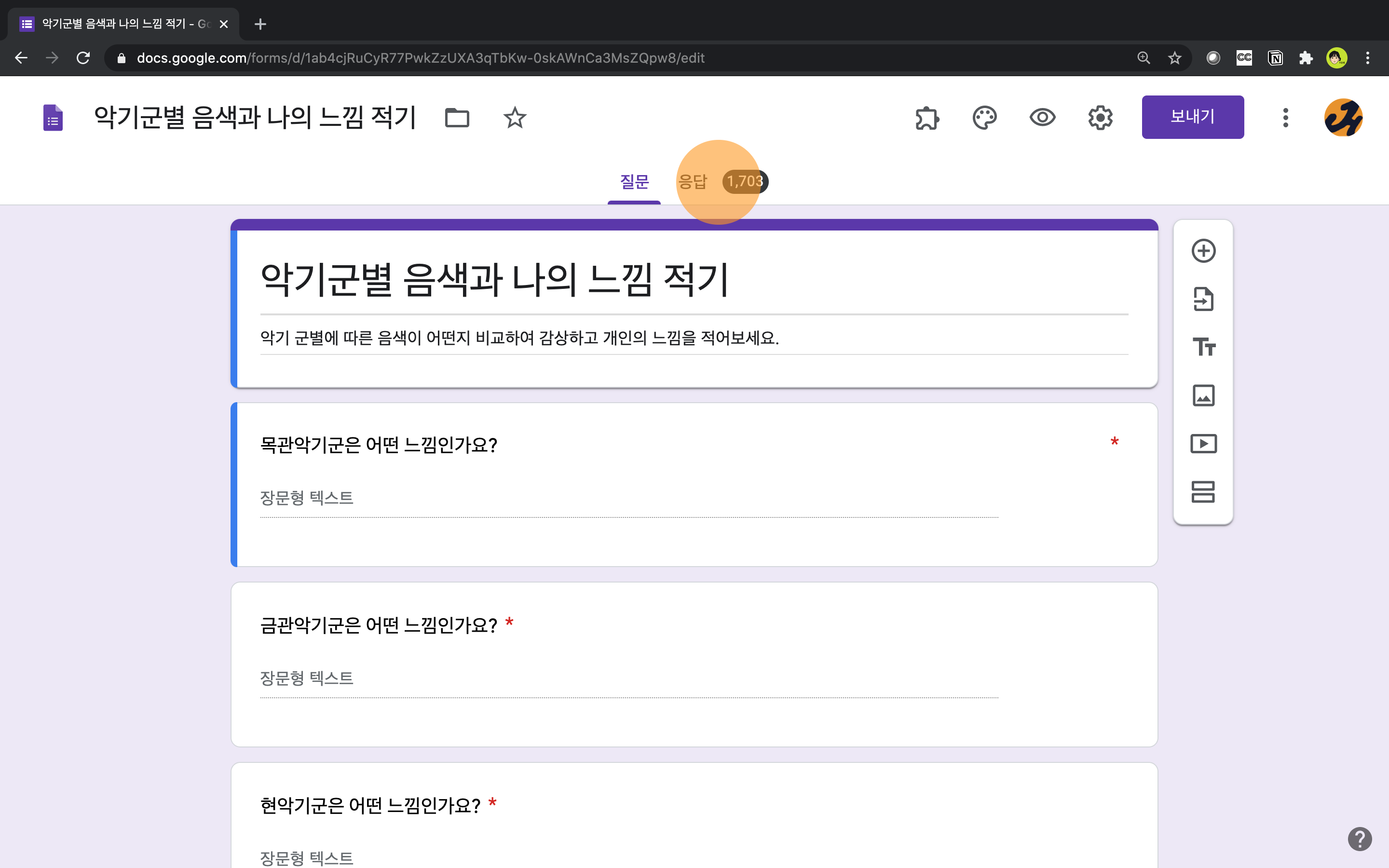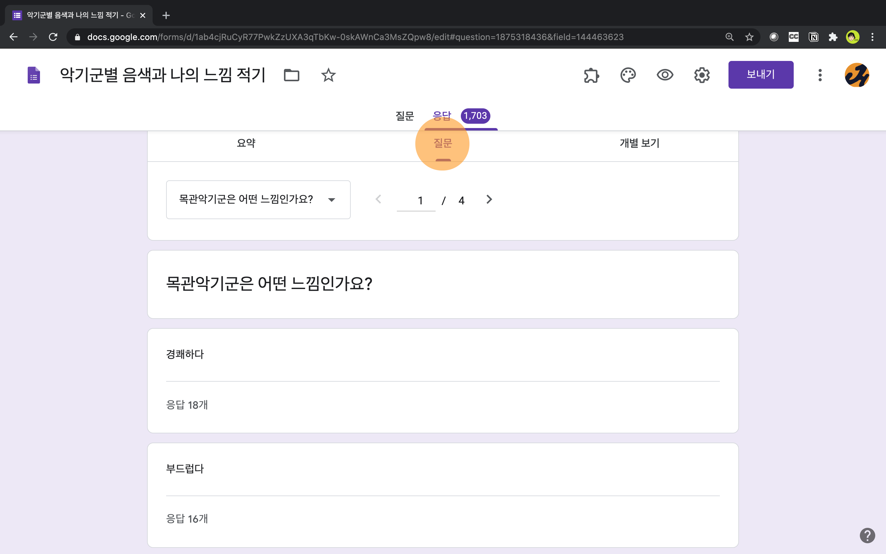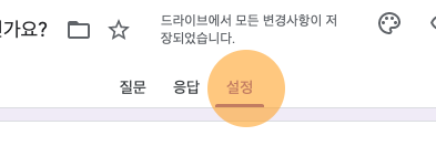 설문지 편집 화면 가운데의 질문 옆의 응답 글씨를 누릅니다. 글씨 옆의 숫자는 현재까지 받은 응답의 개수입니다.