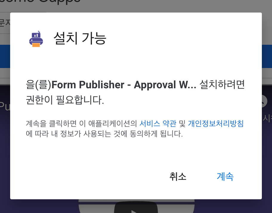 - 설치 버튼을 누르고, 창이 뜨면 계속 버튼을 누릅니다. 그리고 다운로드할 계정을 선택합니다. 이때의 계정을 설문지를 만드는 계정과 동일해야 합니다.