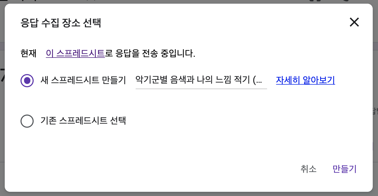 - 기존 스프레드시트 선택: 전체 응답을 기록할 시트를 기존 스프레드시트에 만듭니다. 오른쪽 사진에서 선택 버튼을 누릅니다. 기록할 스프레트시트를 고른 후 선택 버튼을 누릅니다.