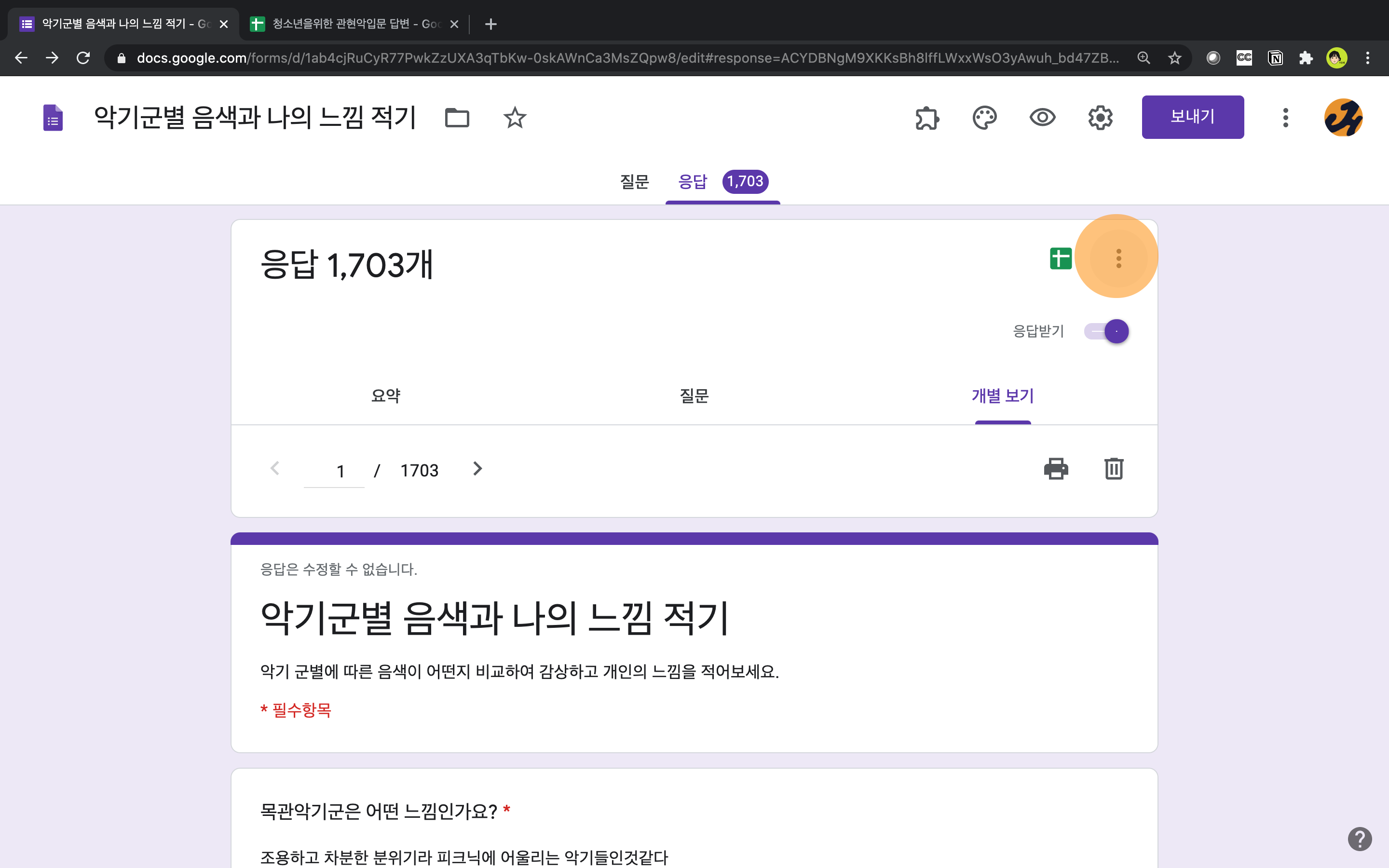 스프레드시트로 응답보기 버튼 옆의 점 3개 버튼을 눌러봅시다.