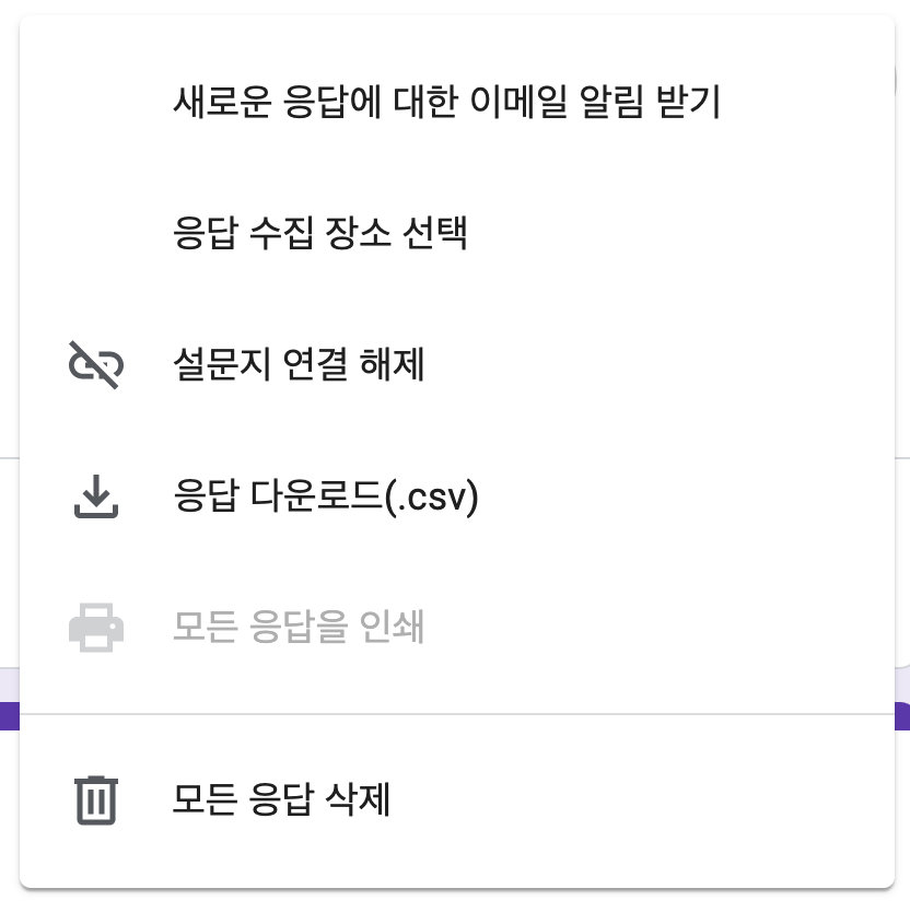 - 모든 응답 삭제: 해당 설문지에 대한 모든 응답을 없앱니다.