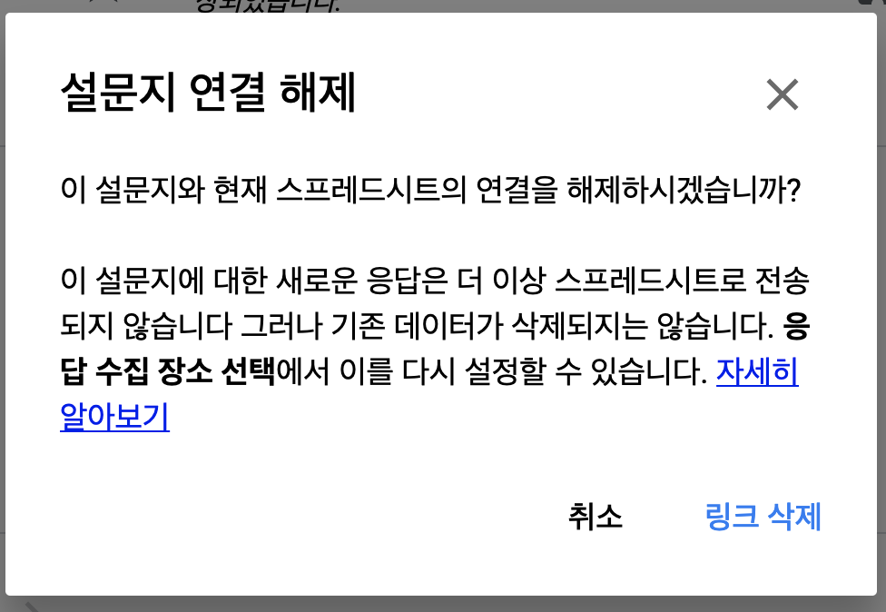 - 설문지 연결 해제: 설문지와 스프레드시트의 연결을 끊습니다. 스프레드시트가 연결된 상태에서만 켜져 있는 기능입니다. (연결을 끊어야 하니까요!) 새로운 응답이 들어와도 더 이상 스프레드시트에는 응답이 기록되지 않습니다.