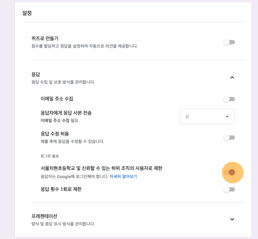 - ~ 및 신뢰할 수 있는 하위 조직의 사용자로 제한: 학생이 학교 계정으로 로그인해야 답변을 제출할 수 있습니다.