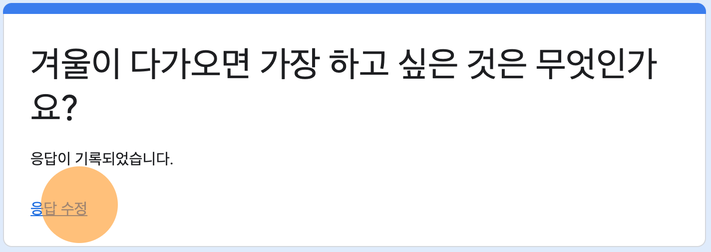 > 제출 후 수정: 로그인 여부와 상관없이, 응답한 사람 모두가 응답을 제출한 후에도 제출한 자신의 응답으로 다시 돌아가서 응답을 수정할 수 있습니다. '응답 수정'이라는 하이퍼링크가 생기는데, 이를 누르면 오른쪽 화면과 같이 응답이 기록된 채로 설문지가 다시 나타납니다.