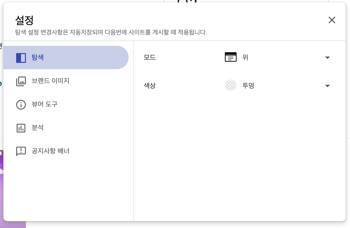 - 정보 아이콘: 게시된 사이트의 왼쪽 하단에 보이는 i 모양 버튼에 대한 설정입니다. 사이트에 대한 정보를 확인할 수 있습니다.