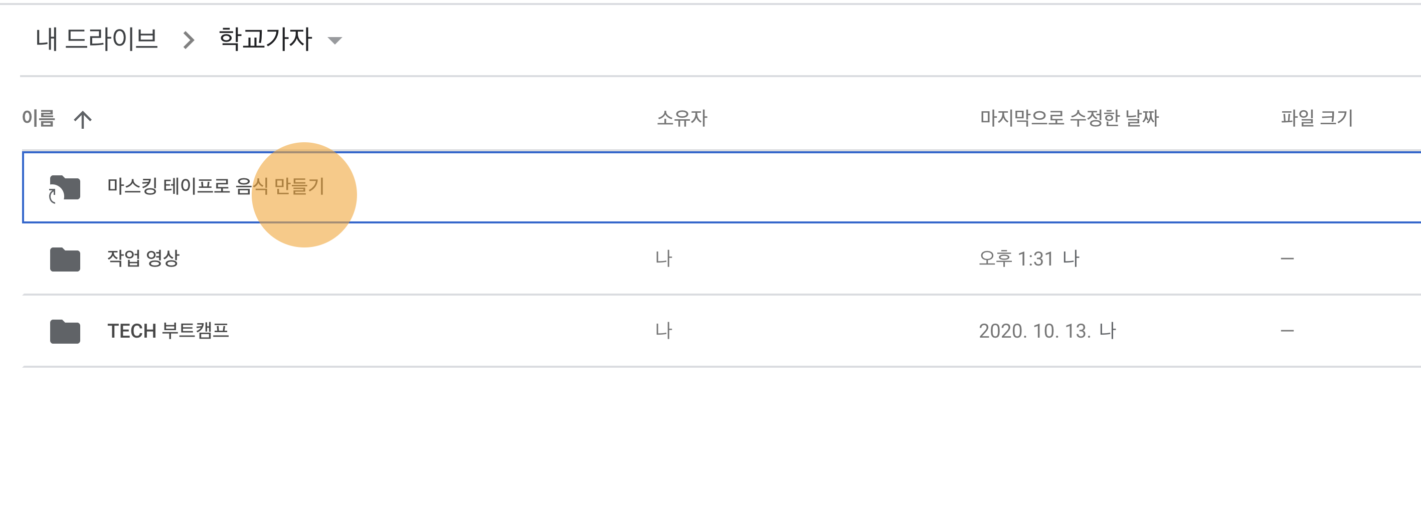 폴더를 만들었습니다! 폴더의 이름, 소유자, 마지막으로 수정한 날짜가 보입니다.