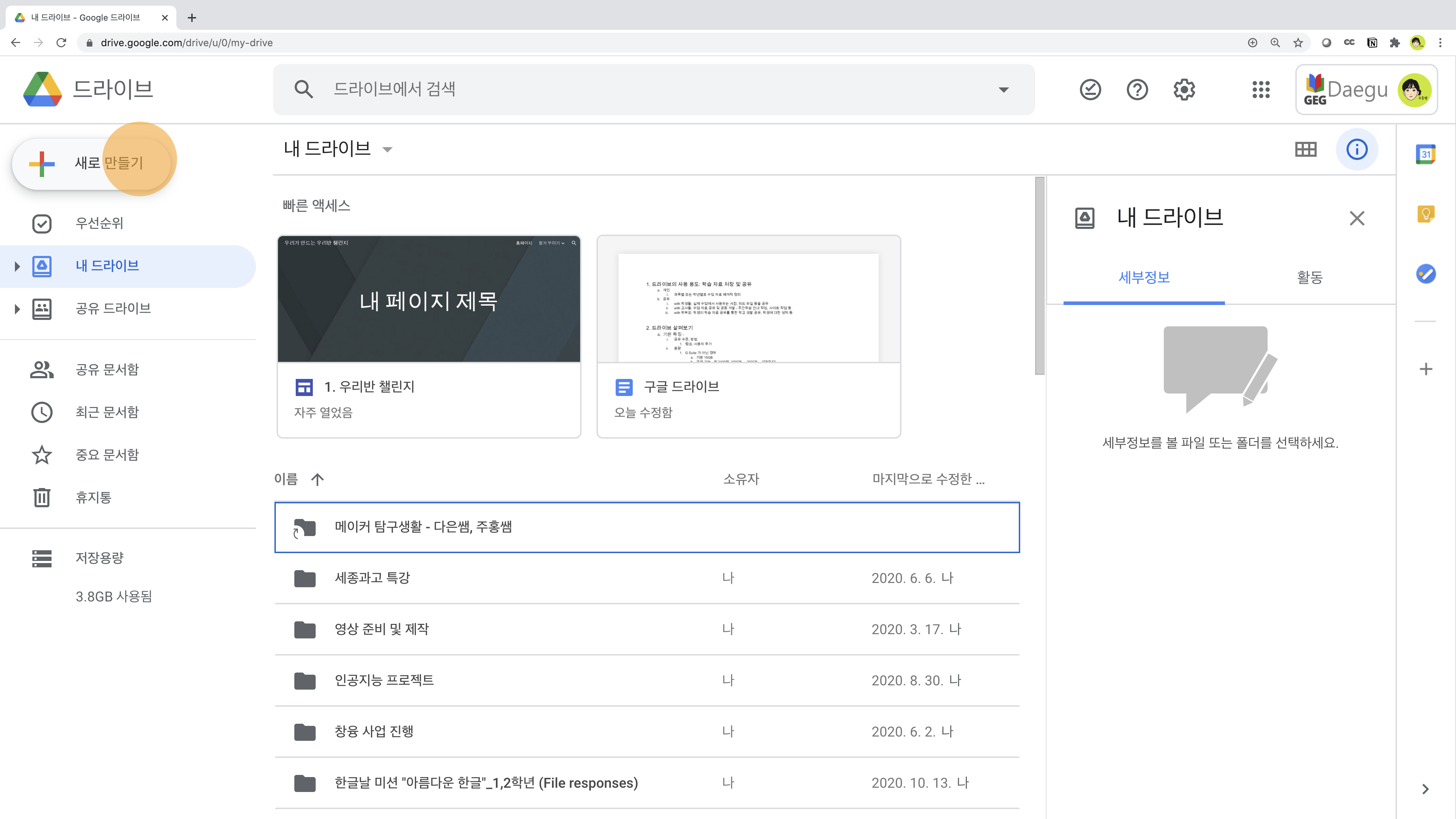 왼쪽의 목록에서 내 드라이브를 눌러 내 드라이브로 이동합니다.