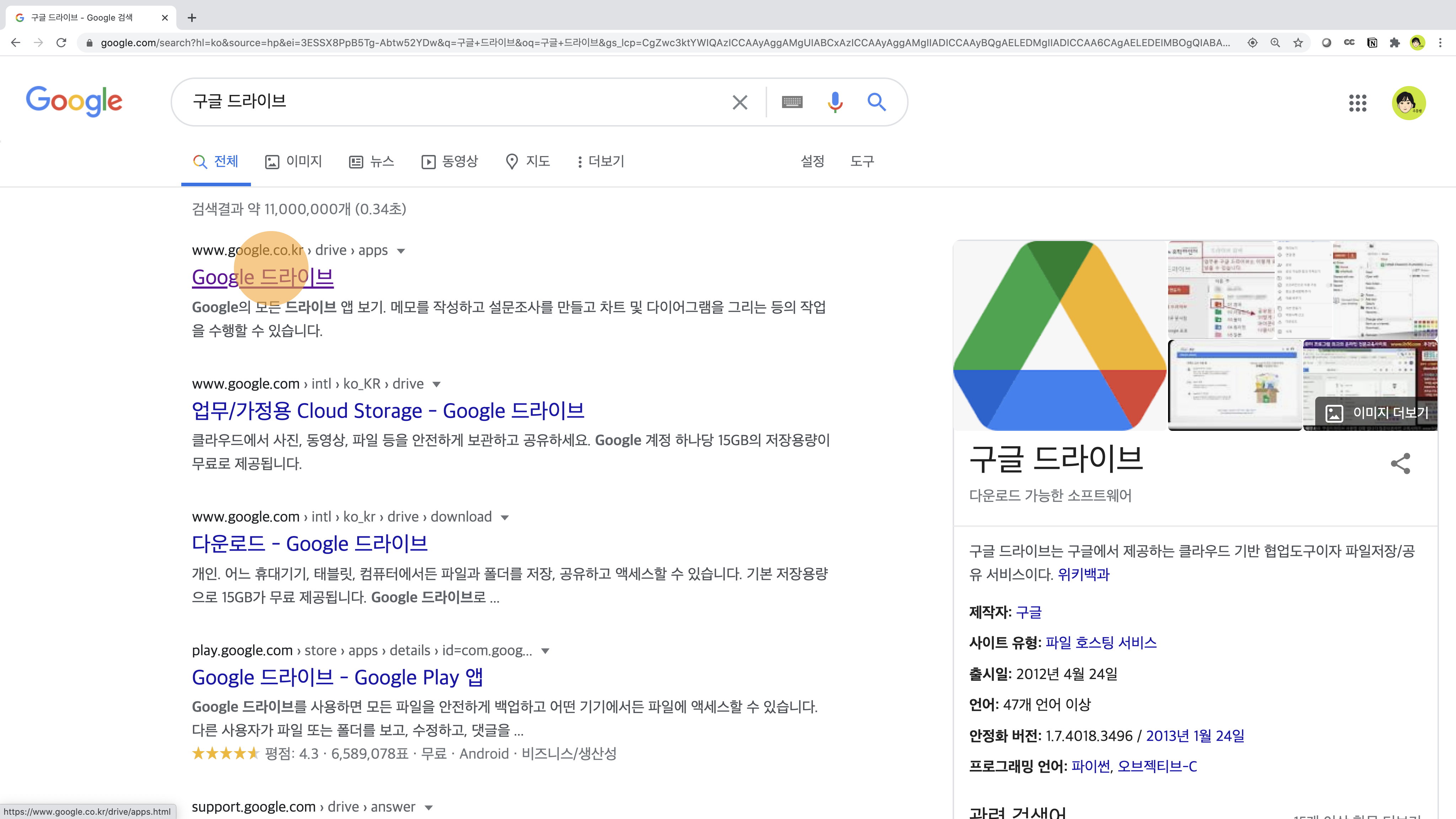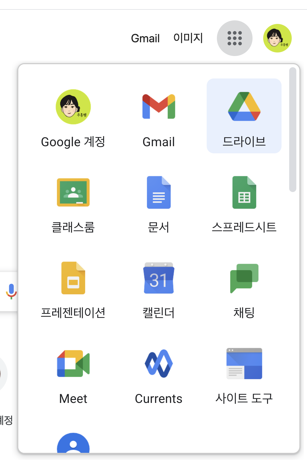 크롬을 사용하고 있다면, 오른쪽 상단에 '이미지'와 프로필 사진 사이의 점 9개 버튼을 클릭합니다. 하단으로 이동하여 드라이브를 클릭합니다.