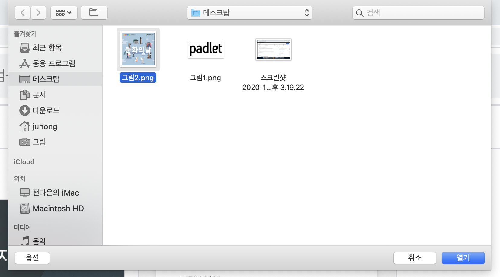 - 해당 기기에서 올리고자 하는 파일을 선택한 후, 열기 버튼을 누릅니다.