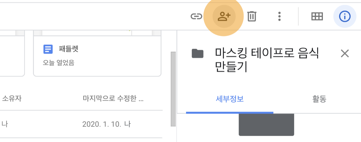 2) 왼쪽 사진과 같이 왼쪽 위의 👤+ 버튼을 누르거나, 선택한 폴더나 파일 위에서 마우스의 오른쪽 부분을 누른 뒤 오른쪽 사진과 같이 공유를 누릅니다. 그럼 아래와 같은 공유 설정 창이 뜹니다.