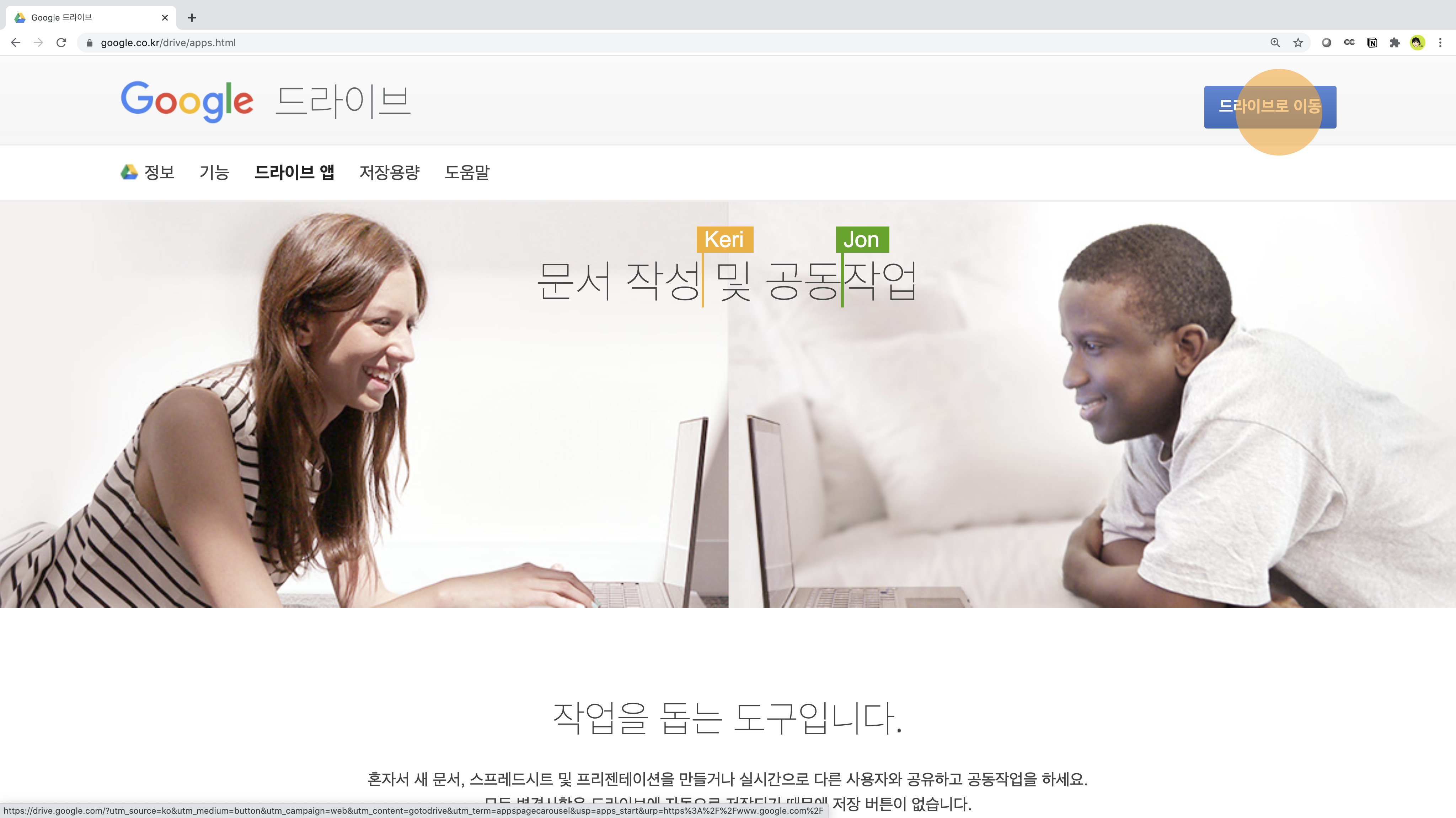 첫 번째로 나오는 주소로 들어간 뒤(https://www.google.co.kr/drive/apps.html), 다음 화면에서 오른쪽 상단의 드라이브로 이동 버튼을 누릅니다.