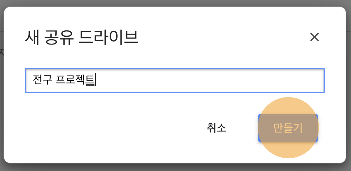 왼쪽 항목 맨 위의 + 새로 만들기 버튼을 누릅니다. 나타난 창에서 만들 공유 드라이브의 이름을 입력하고 만들기 버튼을 누릅니다.