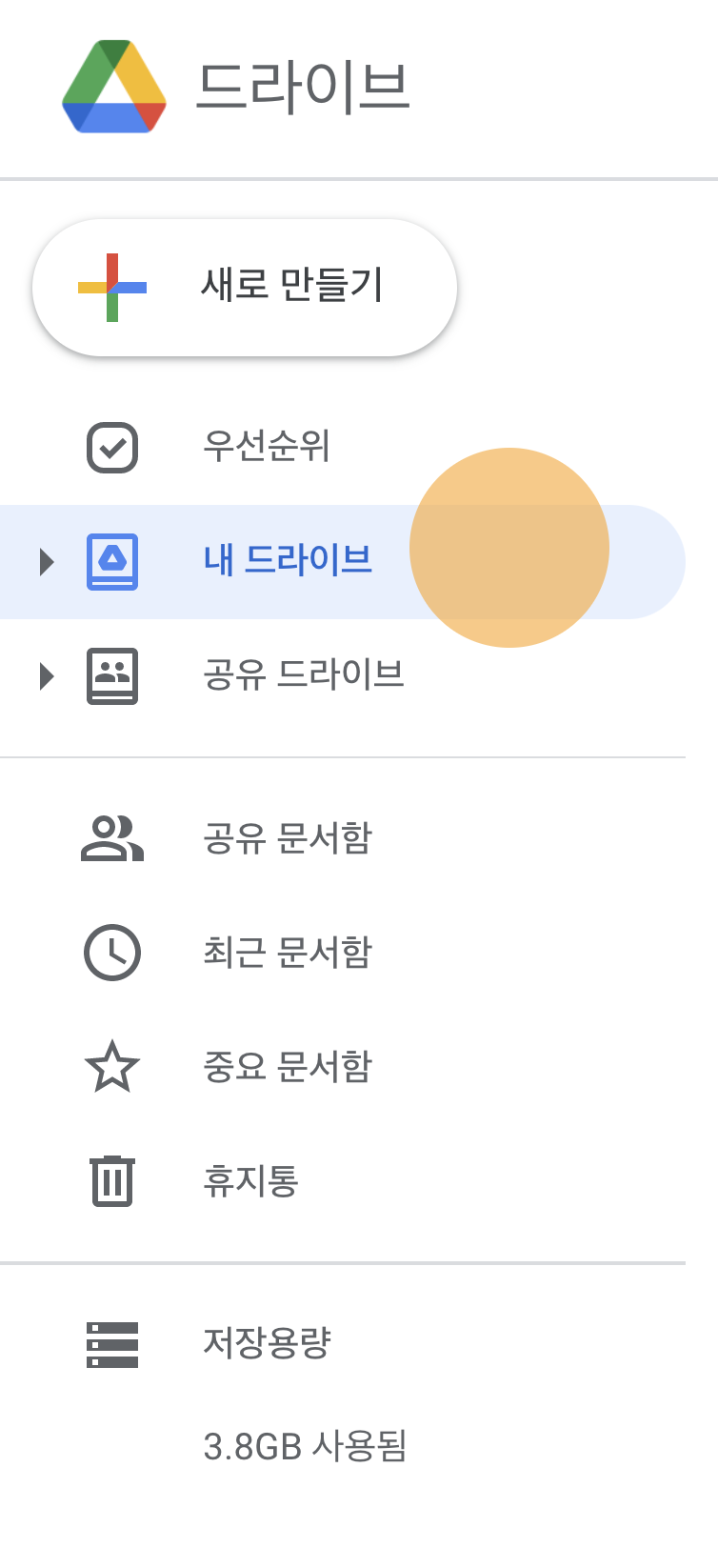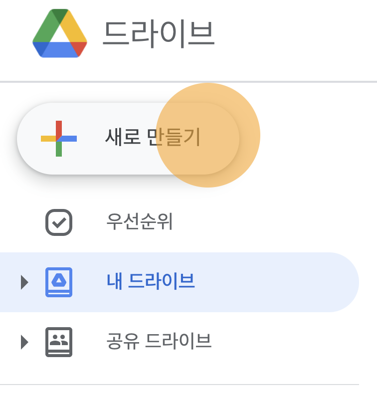 왼쪽의 목록에서 내 드라이브를 눌러 내 드라이브로 이동합니다.