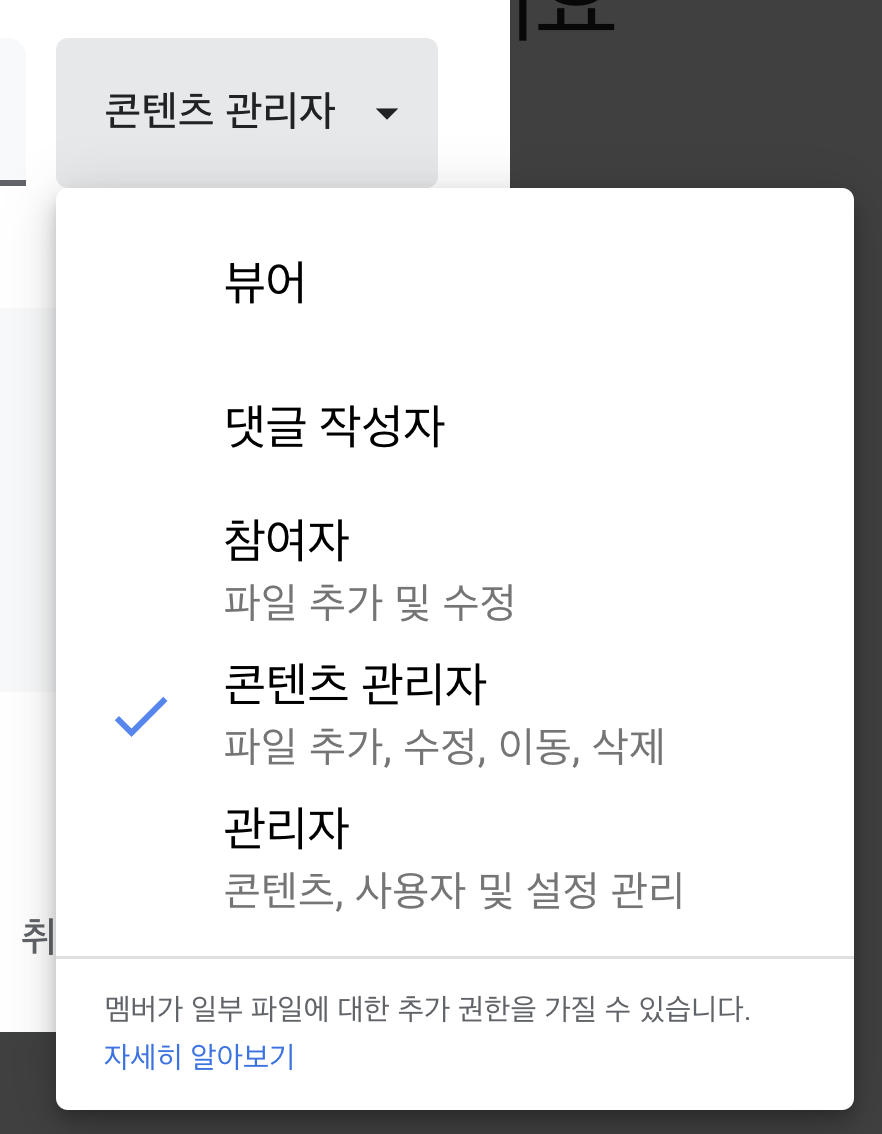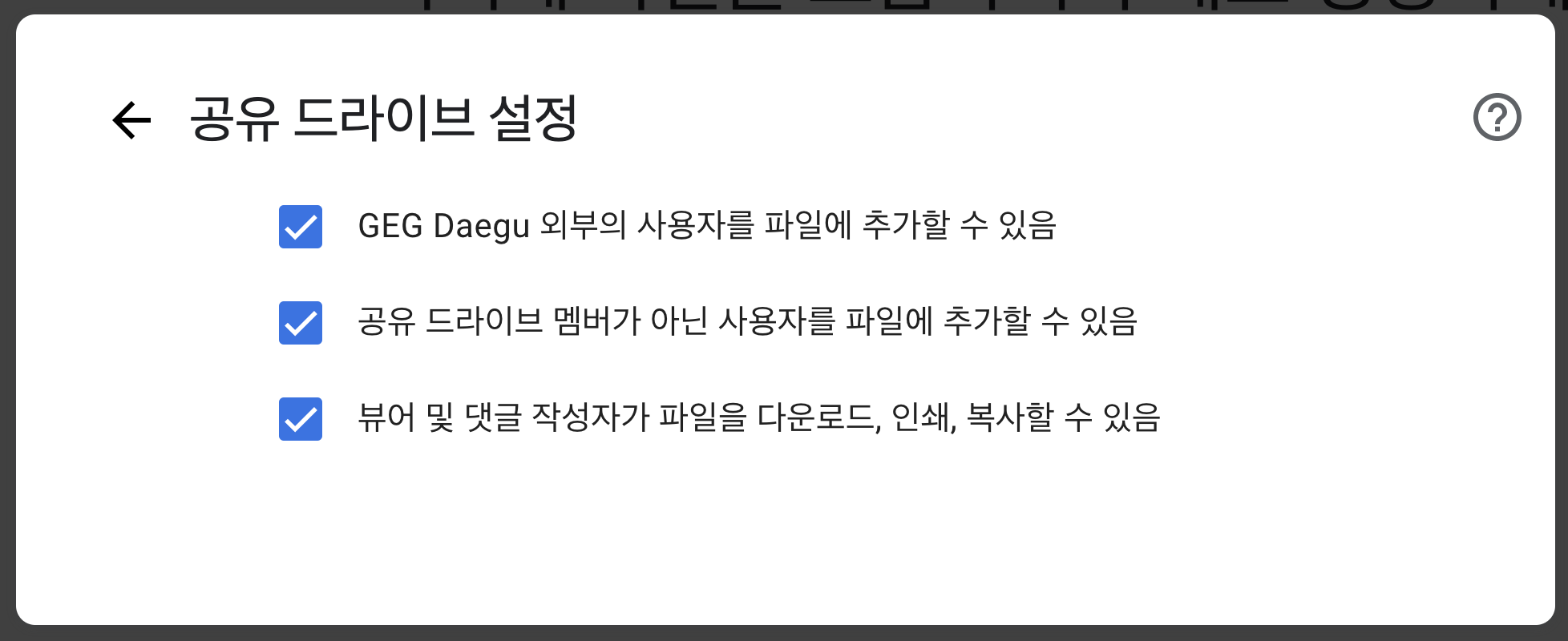 - 공유 드라이브 멤버가 아닌 사용자를 파일에 추가할 수 있음: 드라이브 안 특정 파일에 대한 권한입니다. 멤버가 아닌 사람도 파일을 보거나 편집하게 할 수 있습니다.