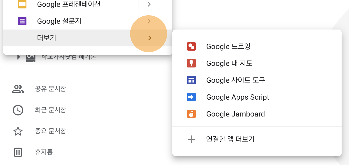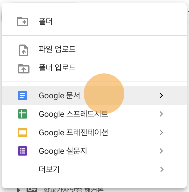 - 문서, 스프레드시트, 프레젠테이션, 설문지의 경우 > 버튼을 누르면 빈 문서와 템플릿 중 선택하여 만들 수 있습니다. '더보기'의 경우 > 버튼을 누르면 오른쪽 사진과 같이 다양한 형태가 나타납니다. 여기서 원하는 형식의 파일을 선택합니다.